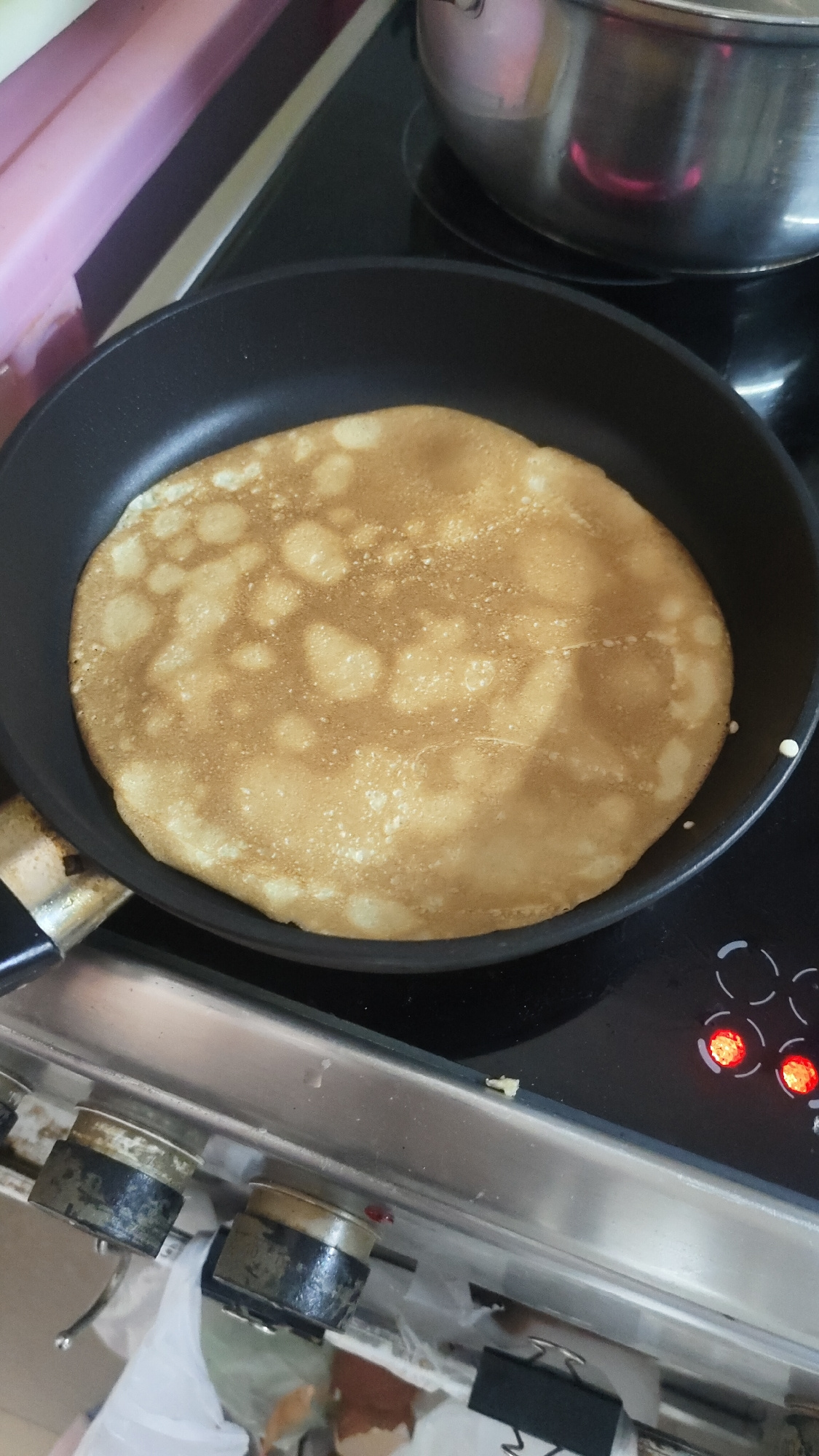 This image captures a domestic cooking scene in a kitchen in Krasnoyarsk, Russia, focusing on a pancake being prepared. The central subject is a round, golden-brown pancake, appearing lightly cooked a…read more
