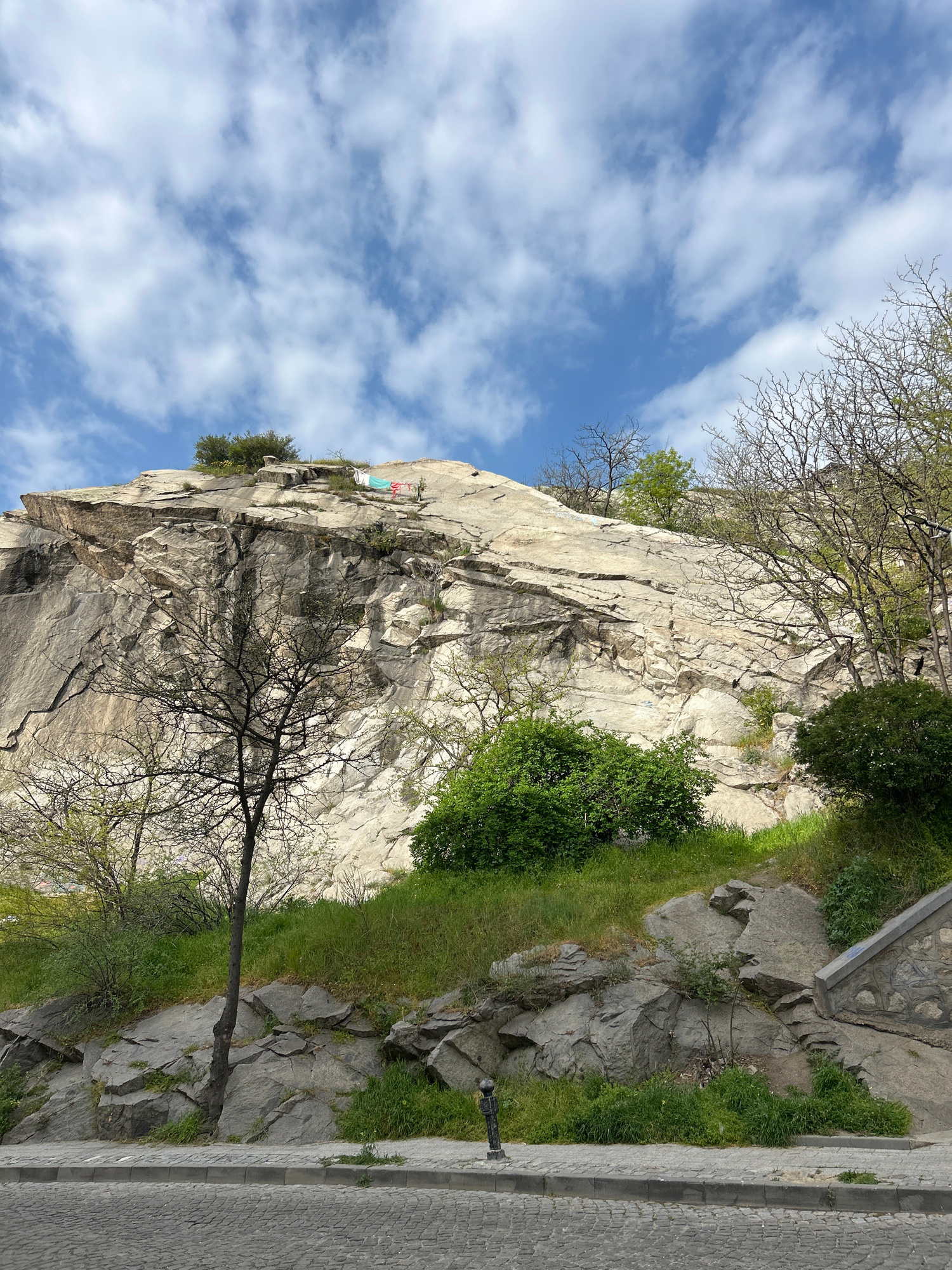 The image shows a large rock formation in Plovdiv, Bulgaria, with a sheer cliff face. The rock is light gray with vertical striations. Trees and bushes grow on top of and along the side of the rock. A…read more