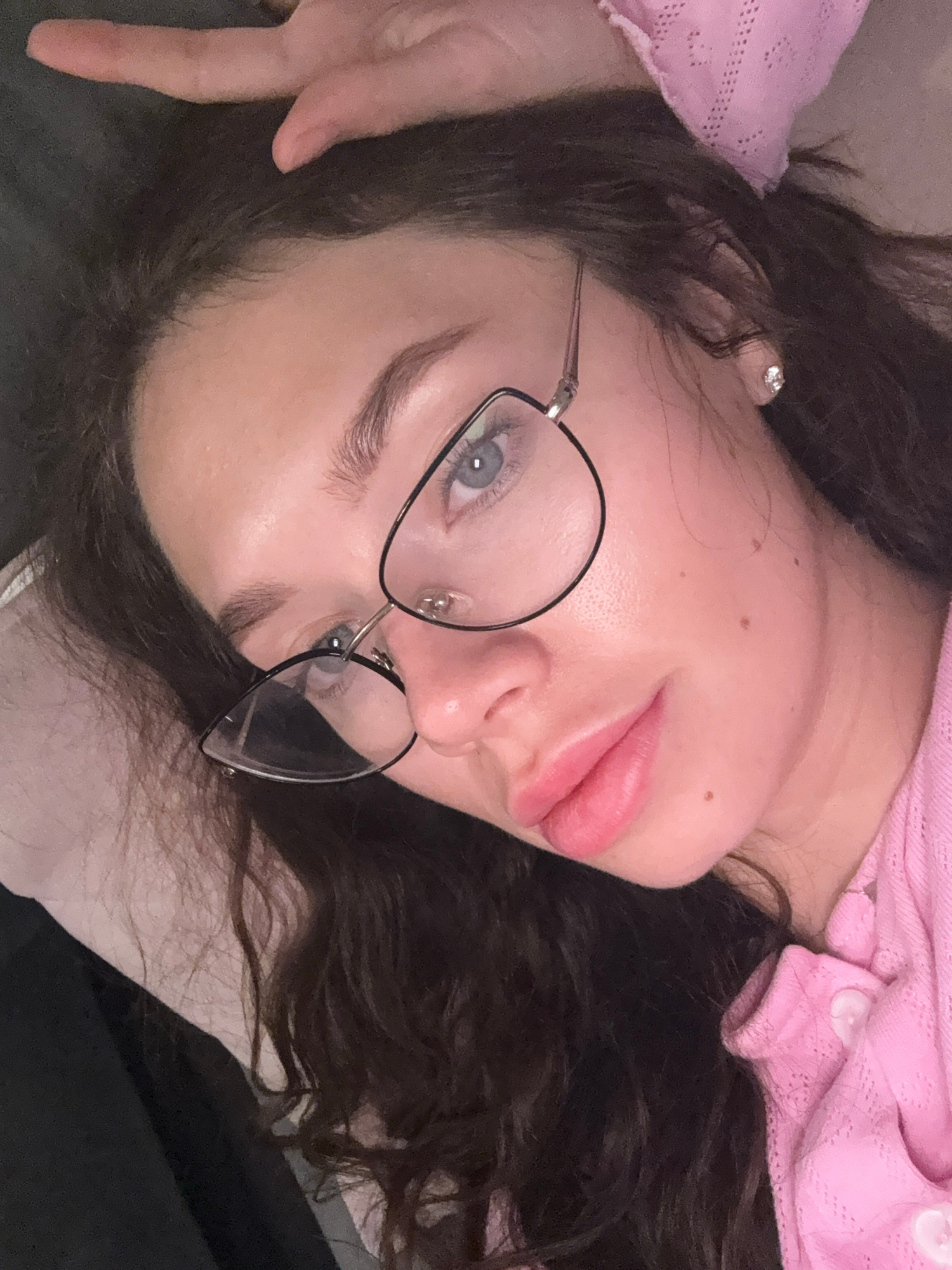 A woman lies on a light-colored surface with her head tilted to the right. She is wearing a pink cardigan with buttons and silver-rimmed glasses. She has dark, wavy hair and blue eyes. Her right hand…read more