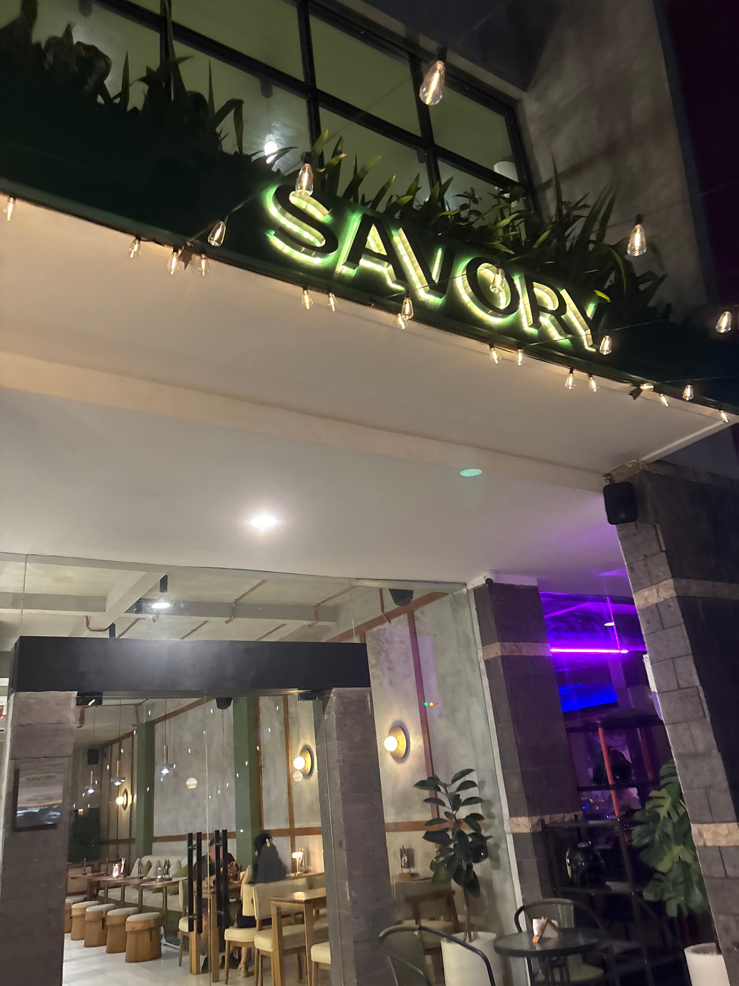 Here is a description of the image: The image depicts the exterior of a restaurant called "Savory" in an urban setting, likely in Unknown, Indonesia. The restaurant's name is prominently displayed in…read more