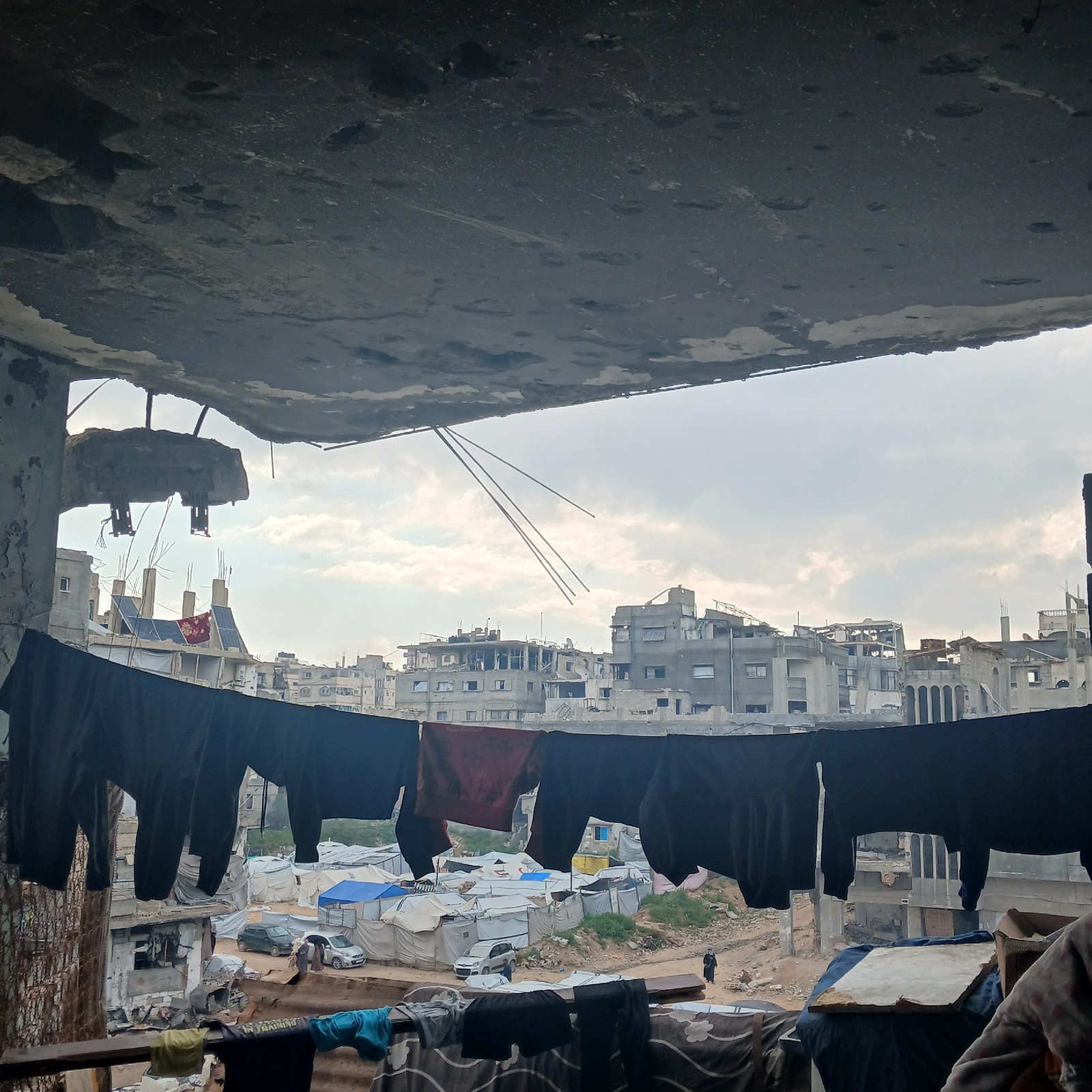 The image depicts a scene in Gaza, Palestinian Territory, characterized by visible war damage and displacement. A partially destroyed building frame, with exposed rebar, occupies the left foreground.…read more