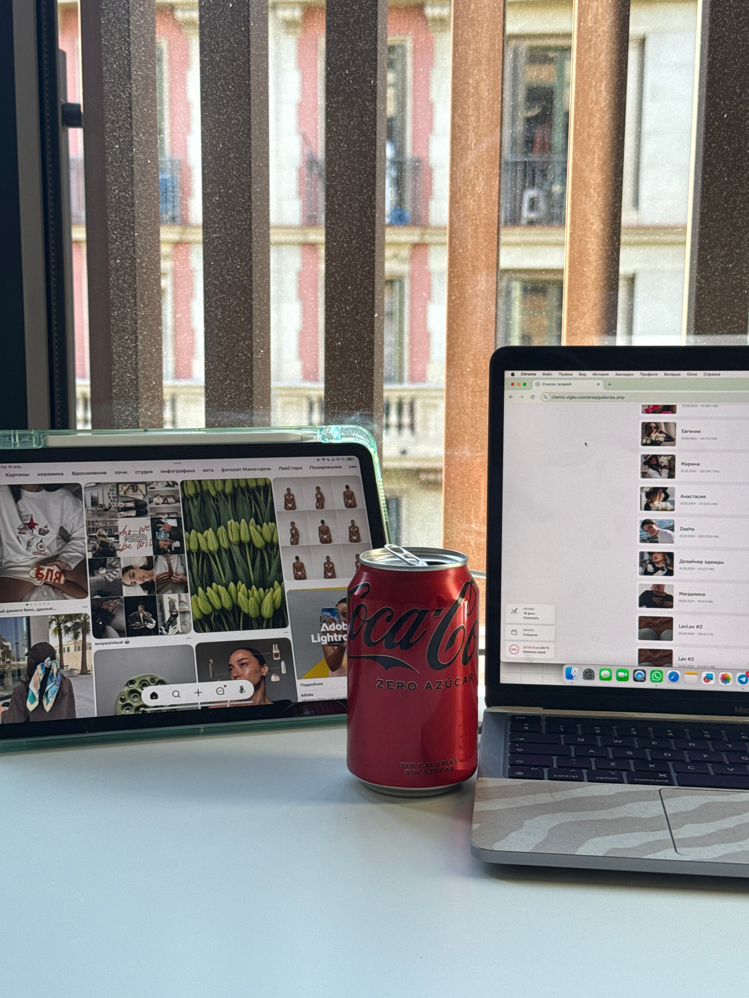 The image shows a desk setup with a laptop, a tablet, and a can of Coca-Cola Zero. The laptop is open, displaying a Chrome browser window with multiple images, likely related to a photo gallery or desβ¦read more