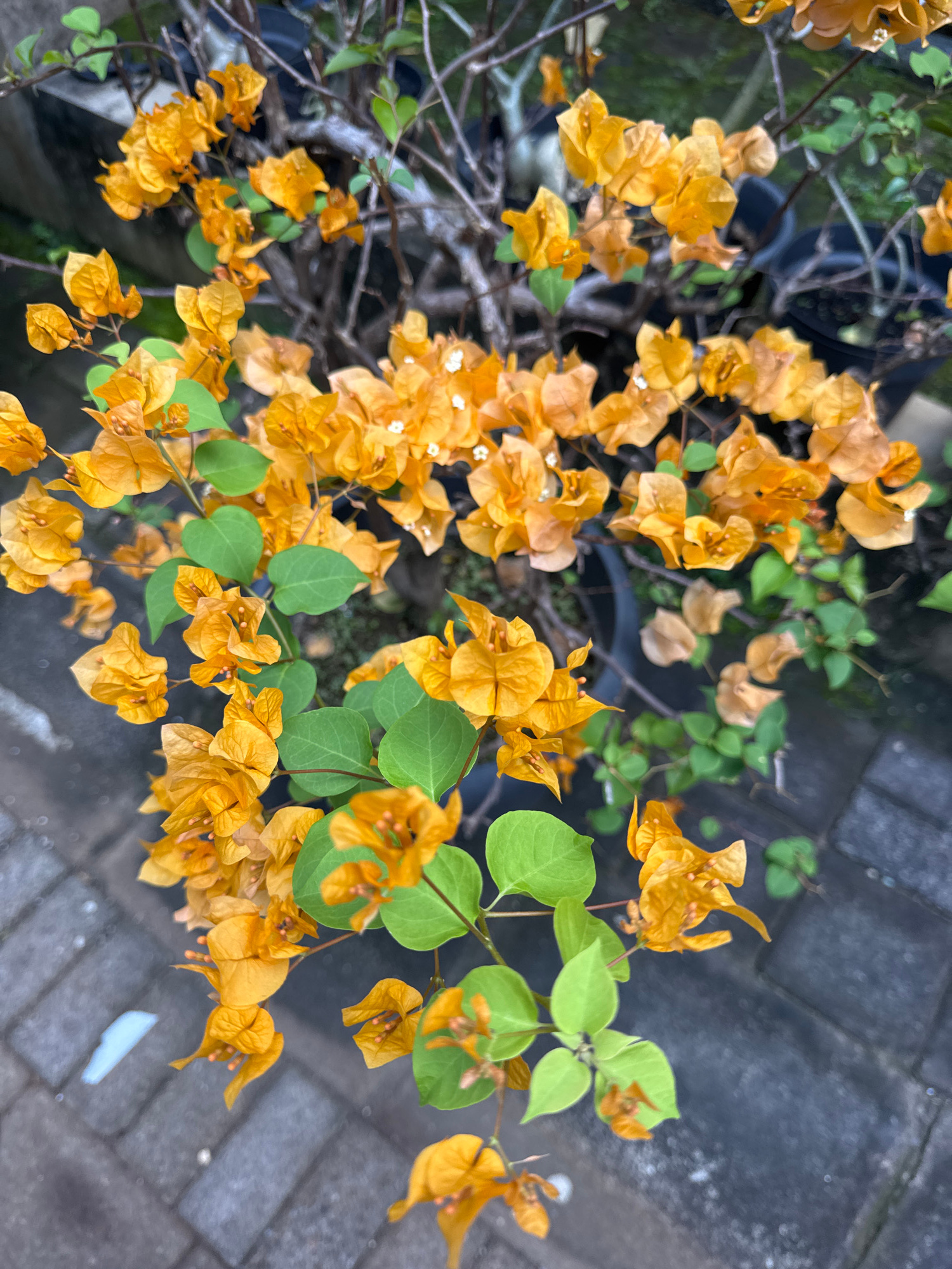The image shows a close-up, overhead view of a potted bougainvillea plant with orange bracts and green leaves. The plant sits on a gray brick-paved surface. The environment suggests an outdoor locatio…read more