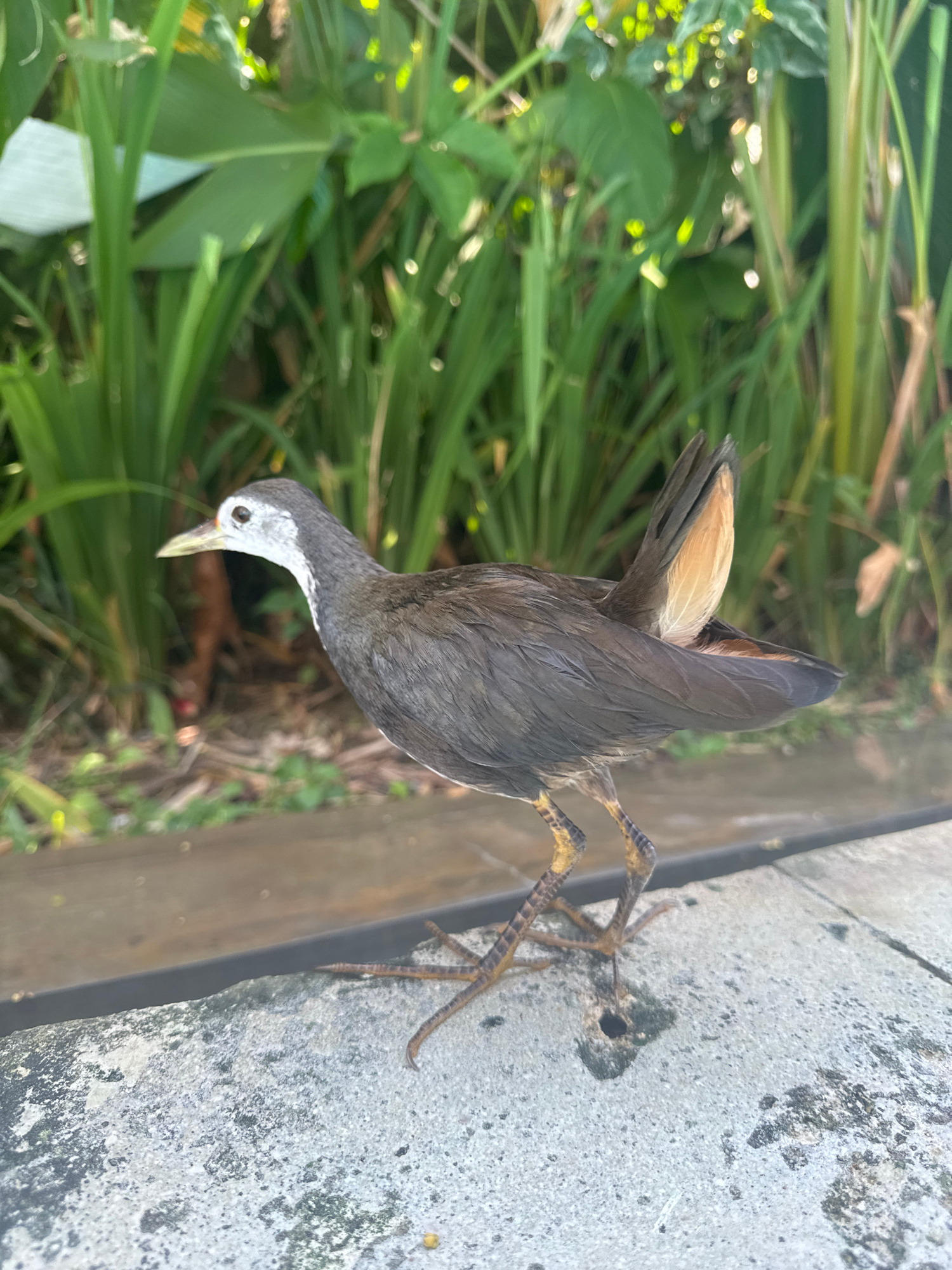 The image depicts a dead white-breasted waterhen lying on a concrete surface near green vegetation. The bird has grey plumage, a white face, yellow legs and feet. It is lying upside down, its feet tou…read more