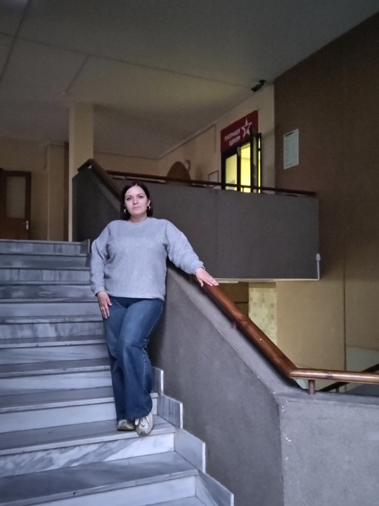The image captures a woman lying on a staircase inside a building, likely in Markovskii, Russia. The woman, with dark hair, is wearing a light gray long-sleeved top, blue jeans, and white sneakers. Sh…read more