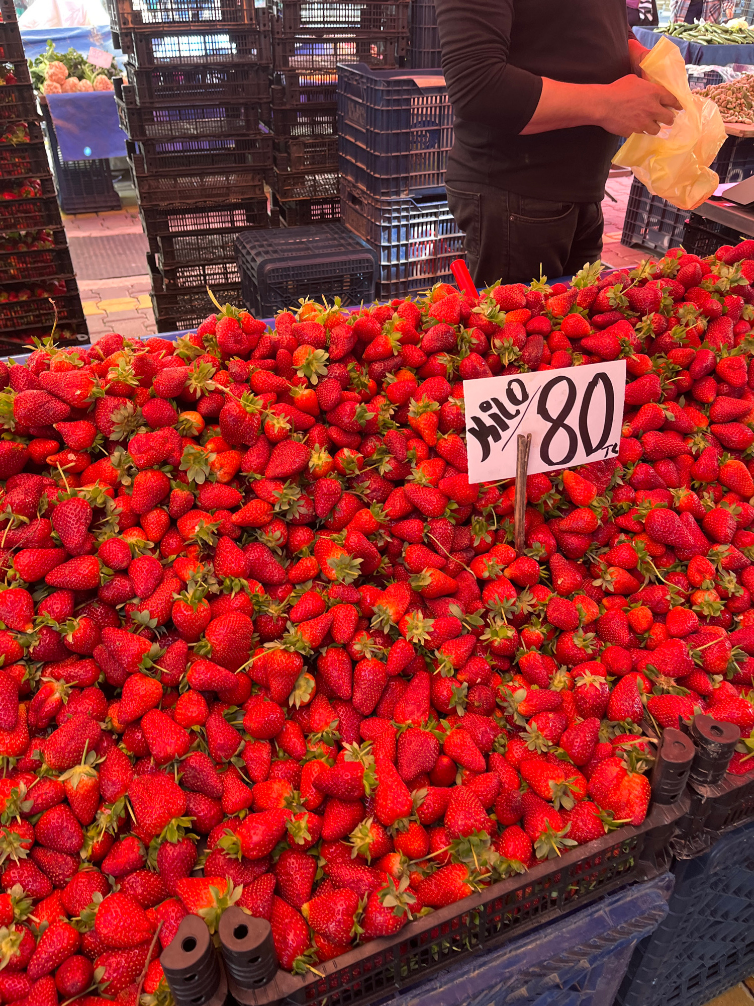 A high-angle shot displays a large quantity of fresh strawberries for sale at a market in Alanya, Turkey. The strawberries, vibrant red, are densely packed and take up most of the frame. A small white…read more