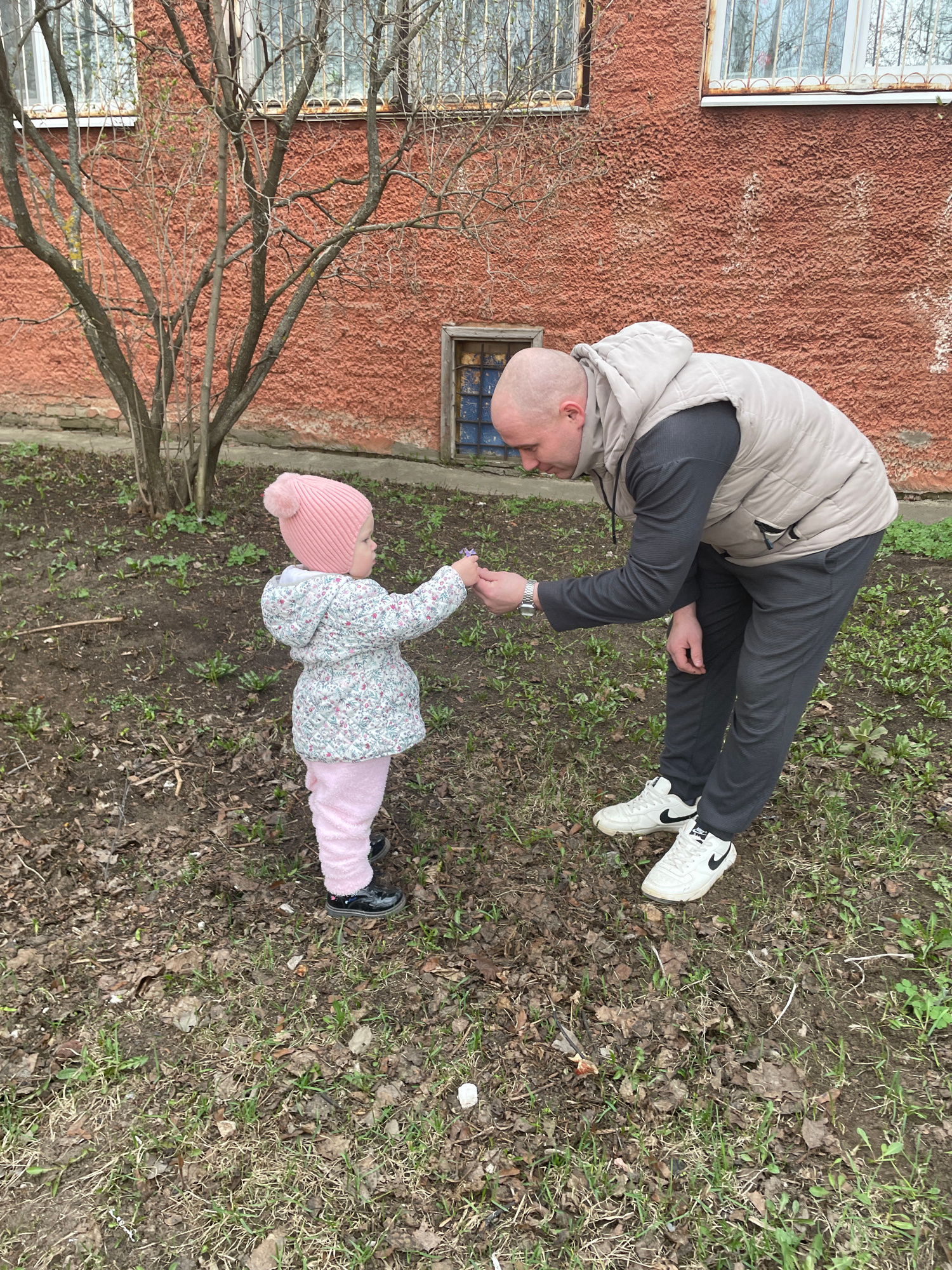 A man bends over to interact with a young child in an outdoor setting. The man wears a tan vest over a dark long-sleeved shirt, dark pants, and white Nike sneakers. He is bald. The child wears a pink…read more