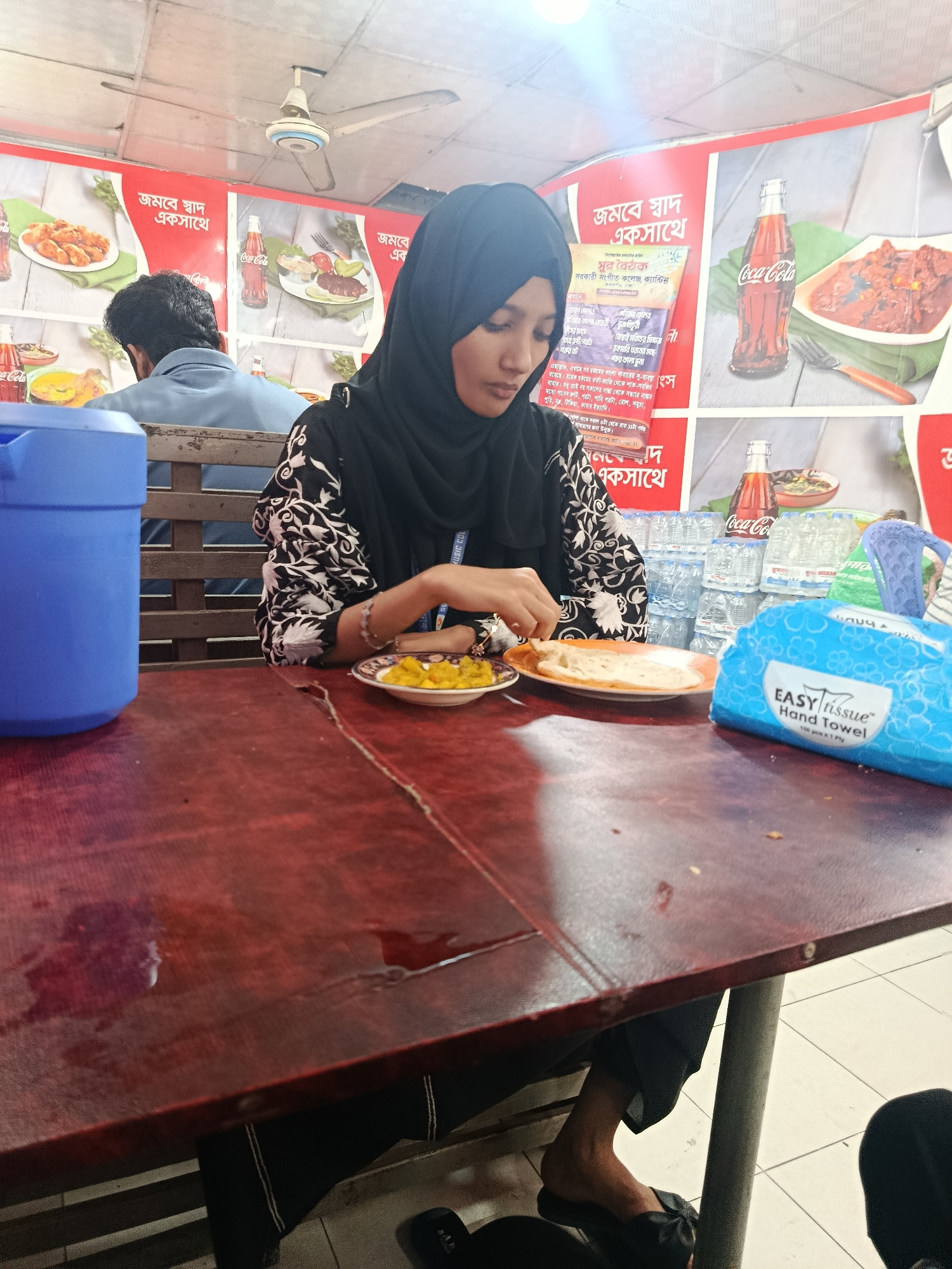 A young woman wearing a hijab and a patterned top is seated at a red-topped table in what appears to be a canteen or restaurant in Dhaka, Bangladesh. She is eating from two plates, one containing what…read more