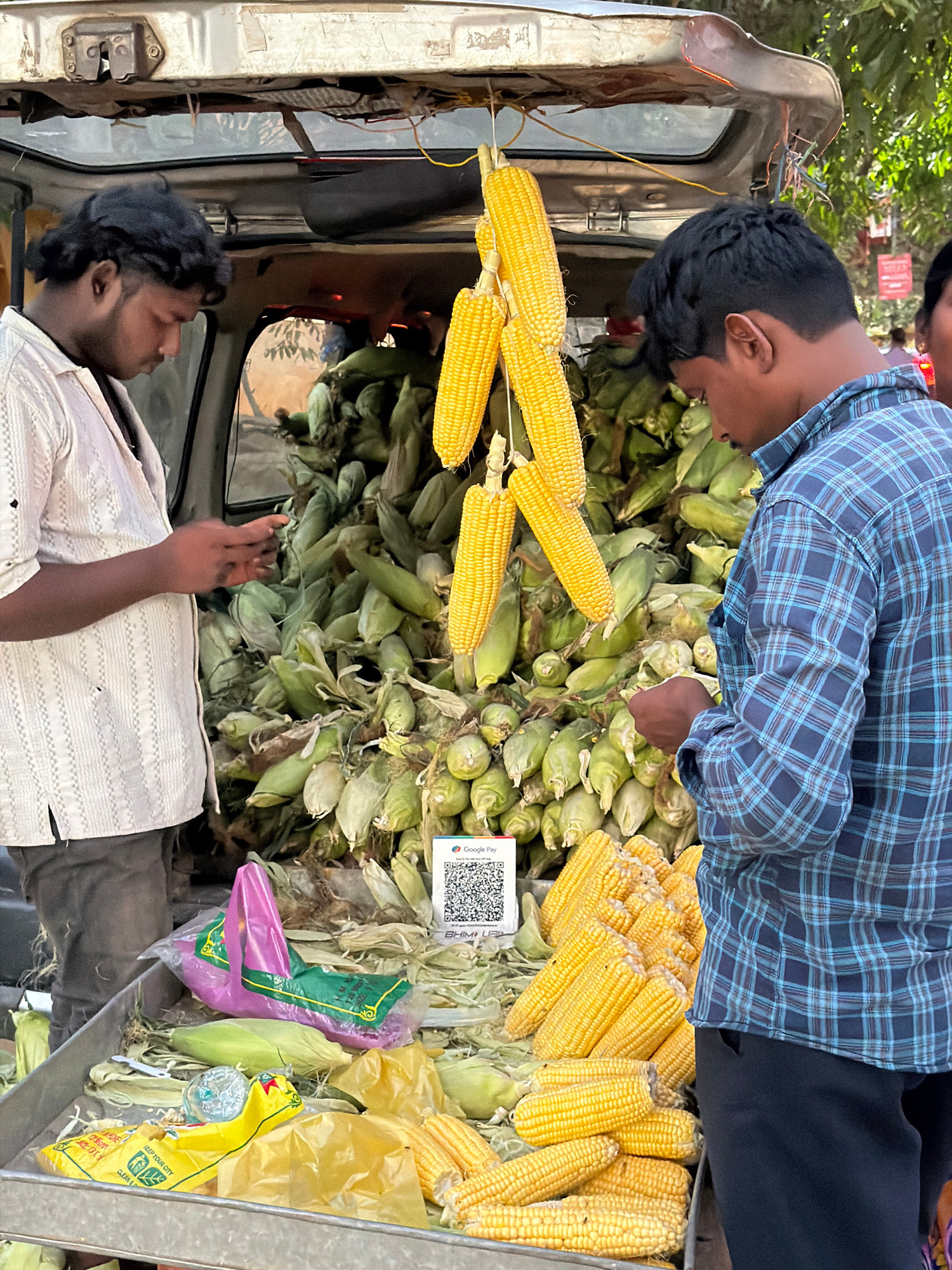Two men are selling corn on the cob from the back of a vehicle. One man is inside the vehicle, wearing a white shirt, and the other is bending over the back of the vehicle, wearing a blue plaid shirt.…read more