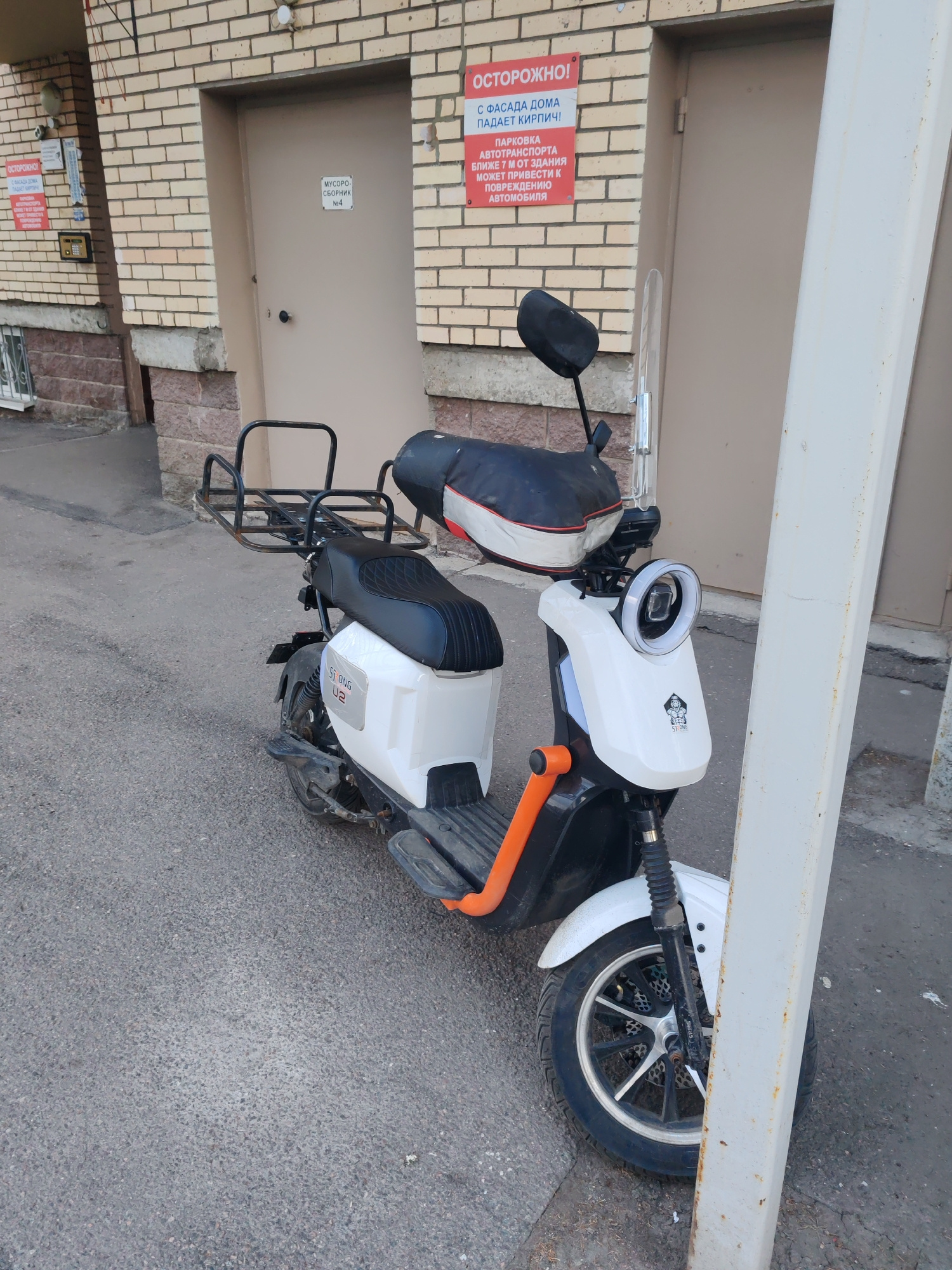 A white and black electric scooter is parked outdoors, angled toward the viewer, against a light brown brick building. The scooter features a large, black metal cargo rack above the rear wheel, a two-…read more