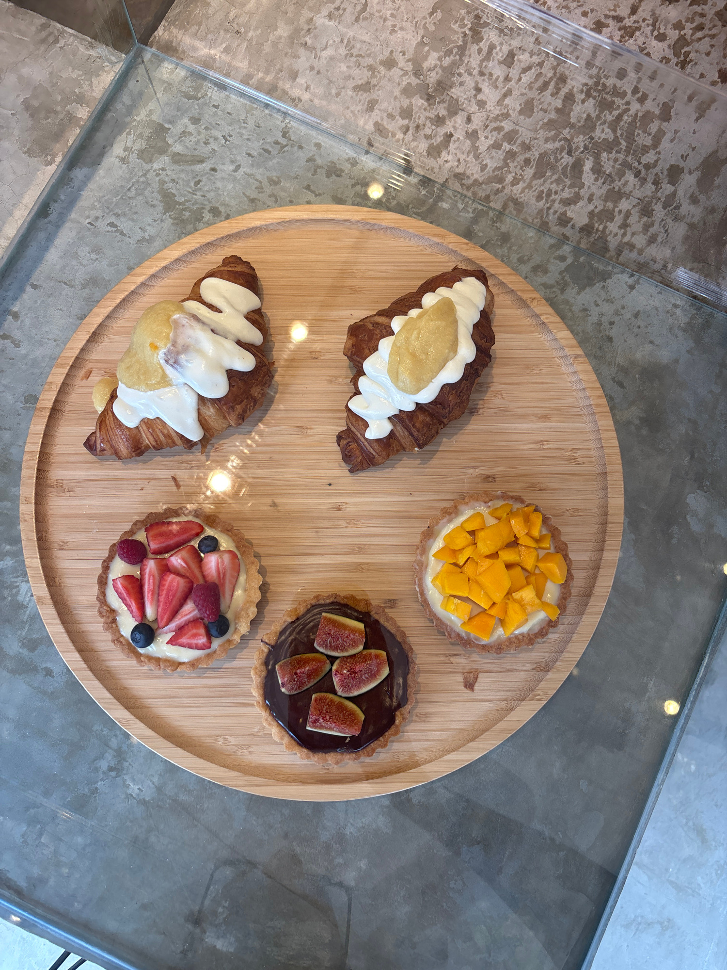 A top-down, medium shot depicts a wooden serving tray containing two pastries resembling filled croissants and three small fruit tarts. The pastries are topped with a white, cream-like filling and a y…read more