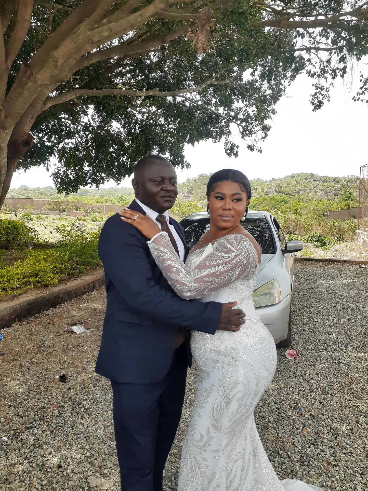 In Jos, Nigeria, a bride in a white, long-sleeved, embellished gown is being held in the arms of a groom wearing a navy blue suit. They are positioned on a gravel surface next to a silver car. The bac…read more
