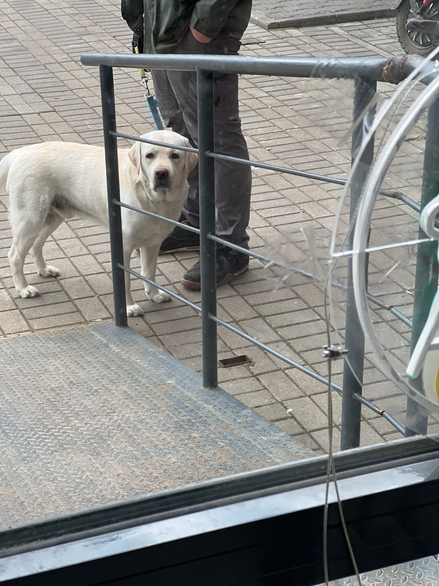 A white Labrador Retriever stands on a sidewalk within the city of Mytishchi, Russia, framed by metal bars from a structure overhead, possibly a bicycle rack or part of street furniture. A person's lo…read more