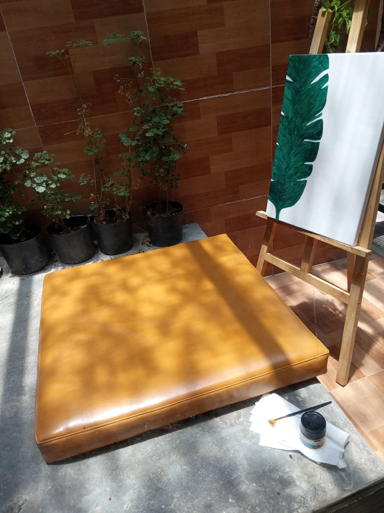 The scene is an outdoor artist's setup in the Bac Natural Heritage Area Trang, Vietnam. A canvas on a wooden easel displays a partially painted green leaf on a white background. A rectangular, golden-…read more