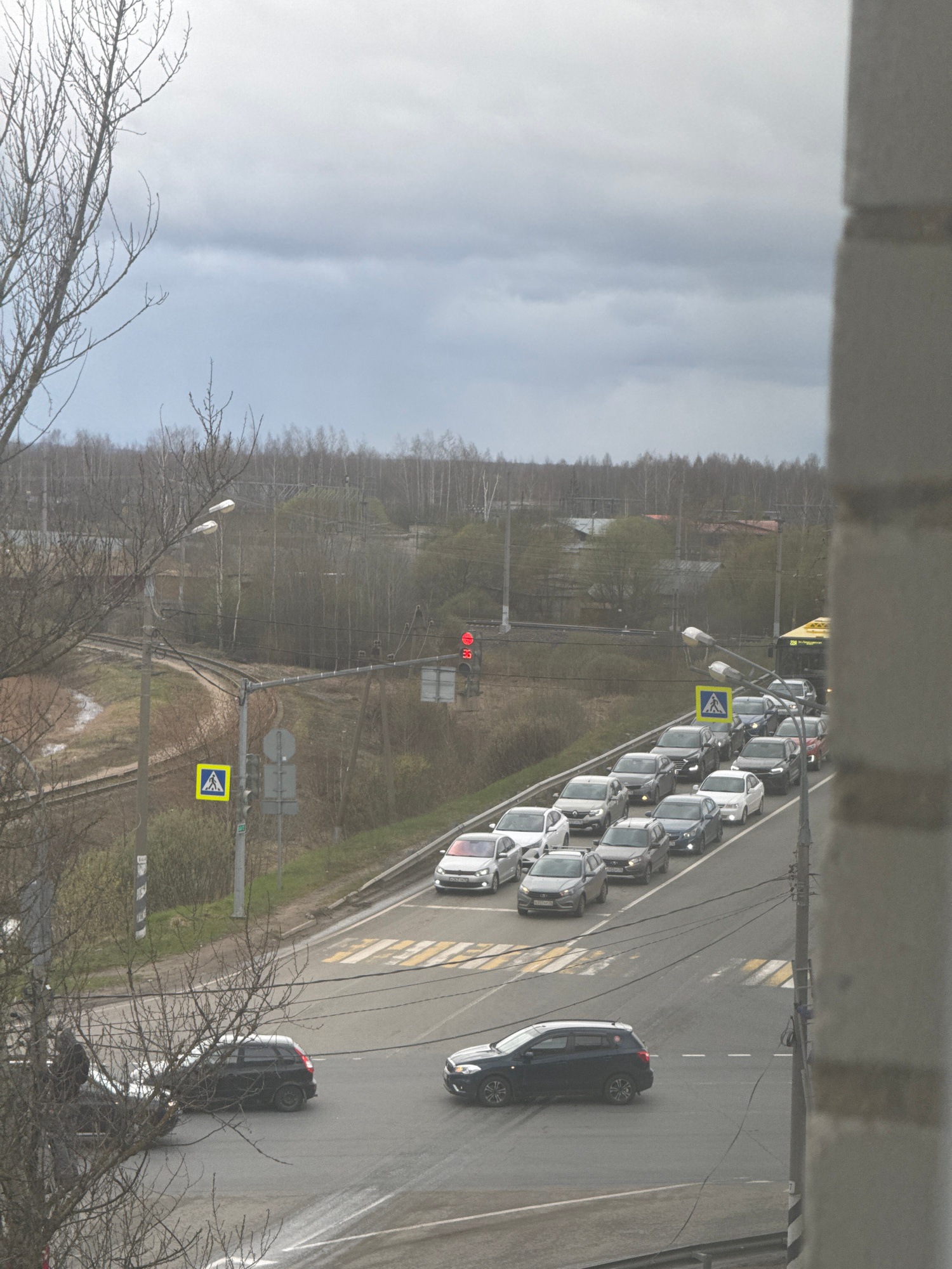 This media file presents an elevated, slightly tilted view of a road in Ново-Никольское, Russia, under an overcast sky. The scene depicts a traffic situation, likely from late winter or early spring,…read more