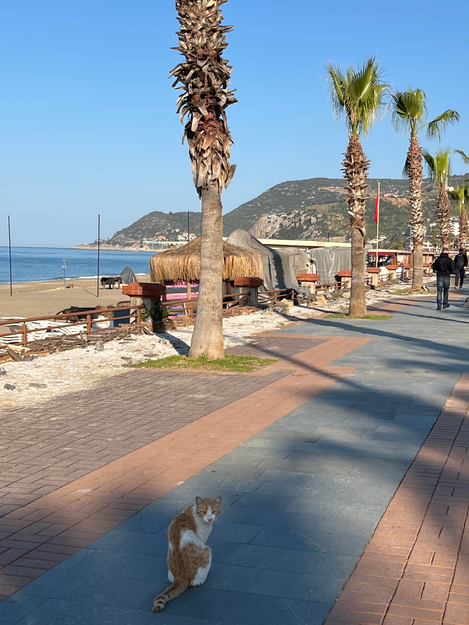 The image depicts a waterfront promenade in Alanya, Turkey, indicated by the coastal setting, palm trees, and structures reminiscent of beachside amenities. The scene features a brick-paved walkway wi…read more