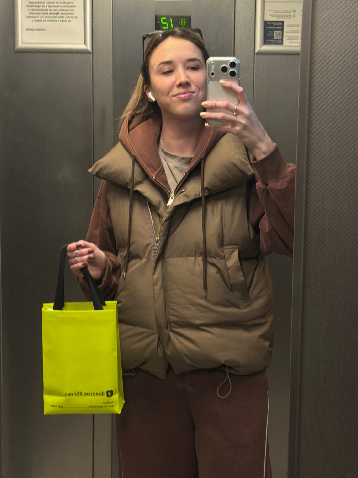 A young woman takes a selfie in an elevator. She wears a brown tracksuit with a beige puffer vest. She holds a bright yellow shopping bag with Russian text on it. The elevator displays the floor numbe…read more