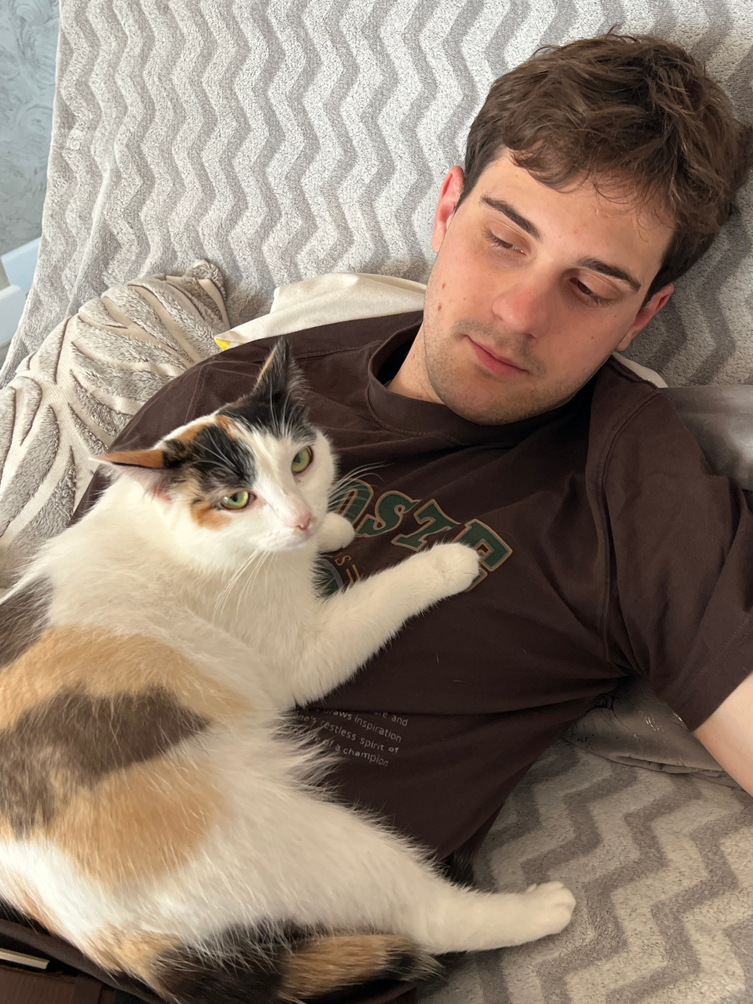 A person lies on a light-colored patterned blanket, wearing a brown t-shirt. A calico cat lies on the person's chest, with one paw raised. The cat is looking up at the camera. The location is Rossiysk…read more