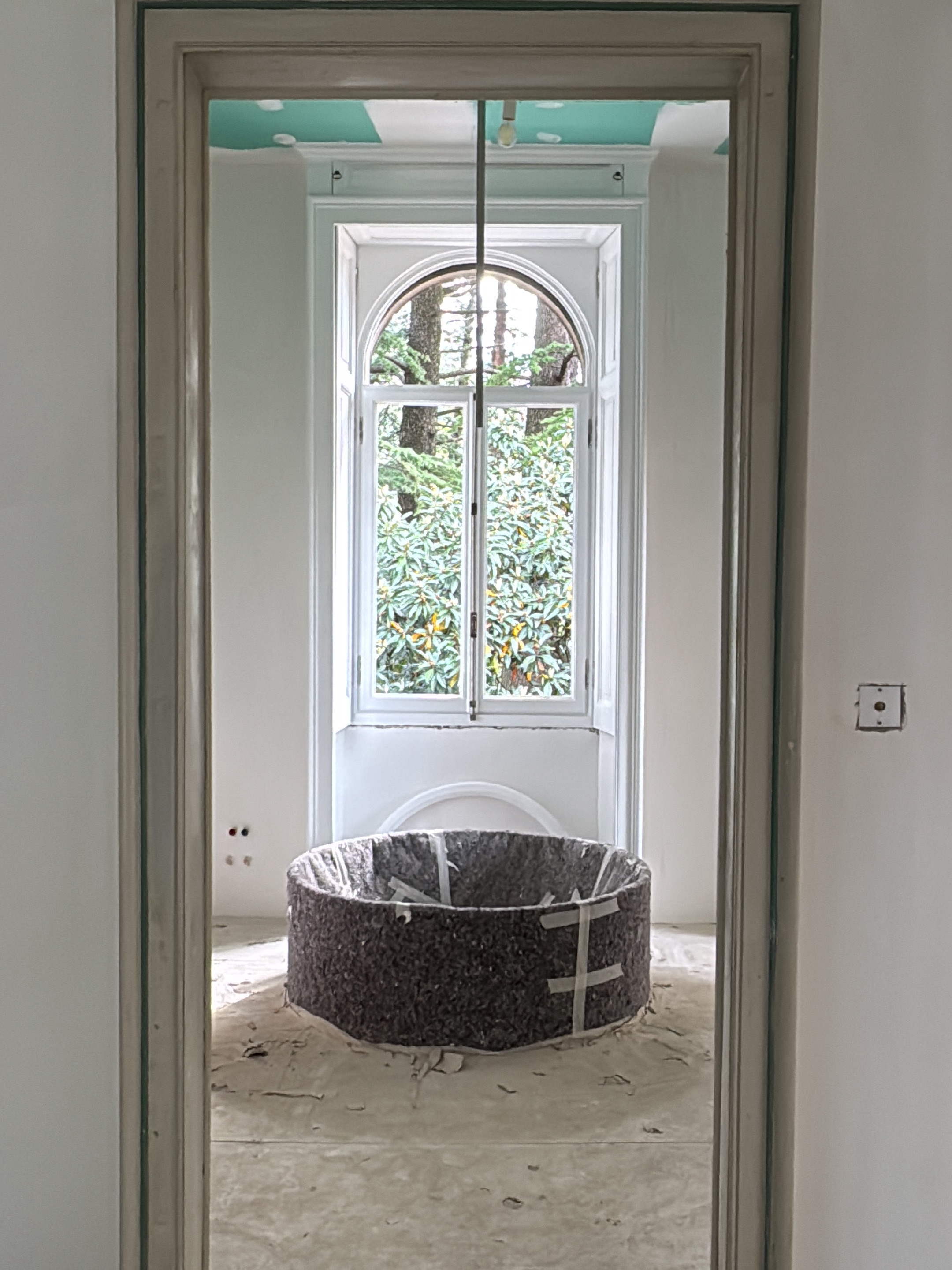 This image depicts an interior room within a building located in Erba, Italy, viewed through a light-colored, decorative wooden door frame. The room appears to be under renovation, indicated by scatte…read more
