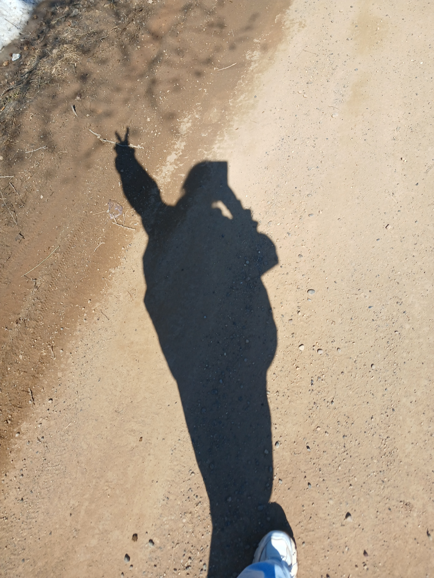 The image captures a person's shadow cast onto a light brown, sandy, or dirt ground, likely in Bolshaya Sosnova, Russia. The shadow depicts the person holding an object, possibly a phone or camera, to…read more