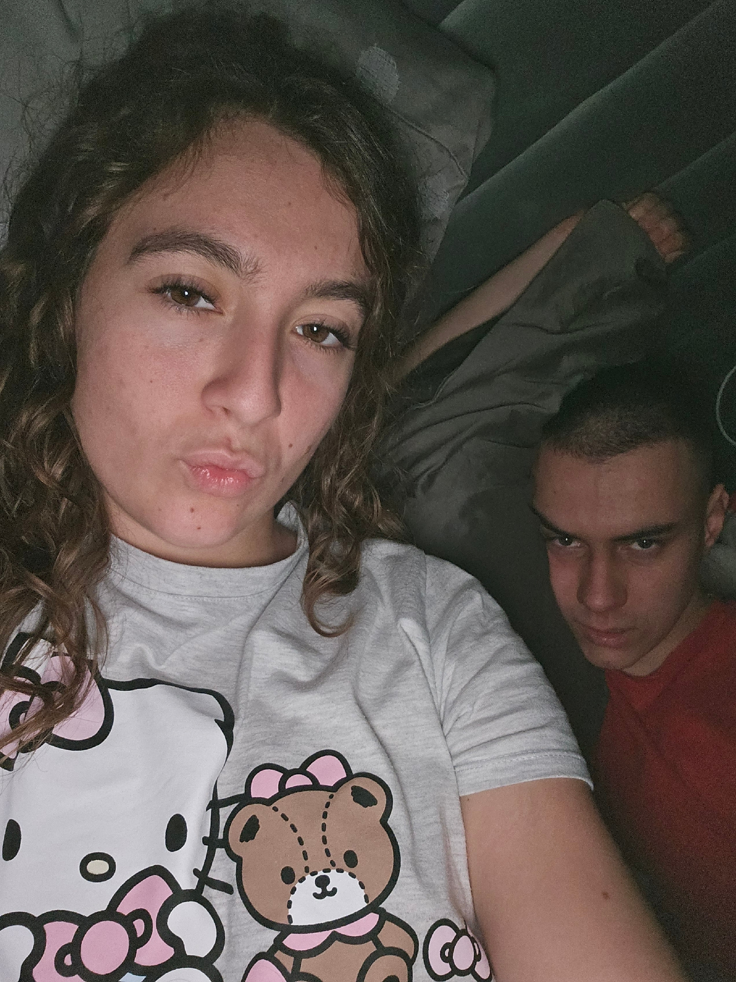 Two individuals are lying on a cushioned surface, possibly a sofa or bed. A young woman with curly brown hair and fair skin is in the foreground, looking directly at the camera with a slight pouting e…read more