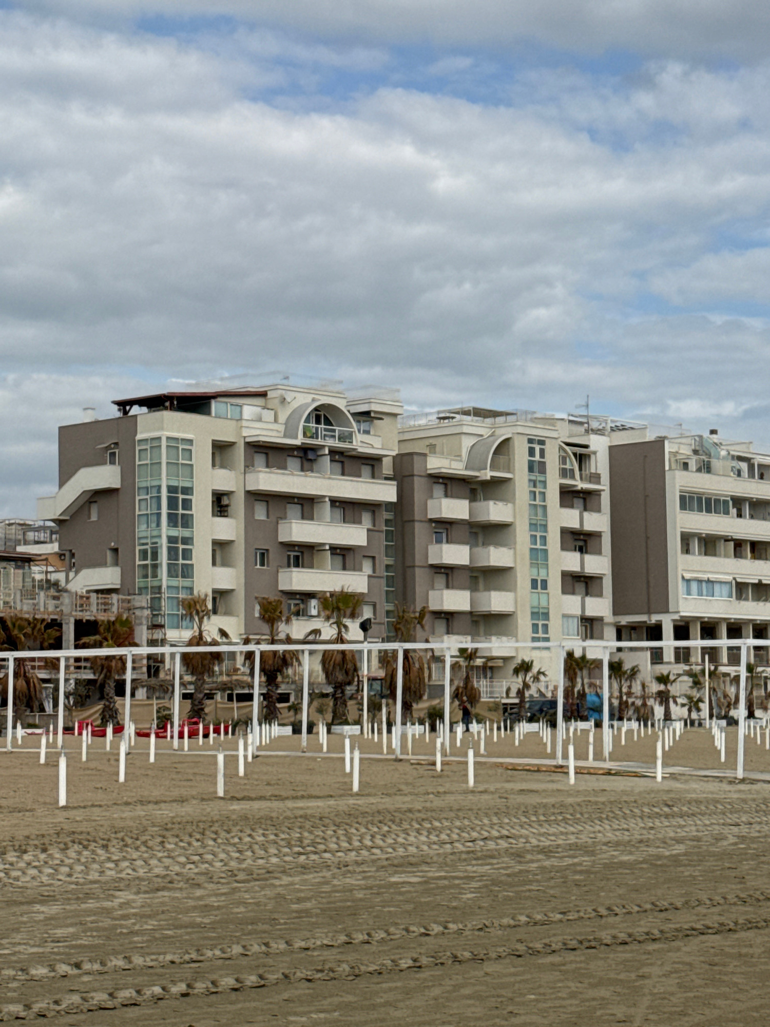 The image, when viewed in its correct orientation (rotated 90 degrees counter-clockwise), displays a coastal scene featuring multi-story buildings, a sandy beach, and a cloudy sky. On the left side o…read more
