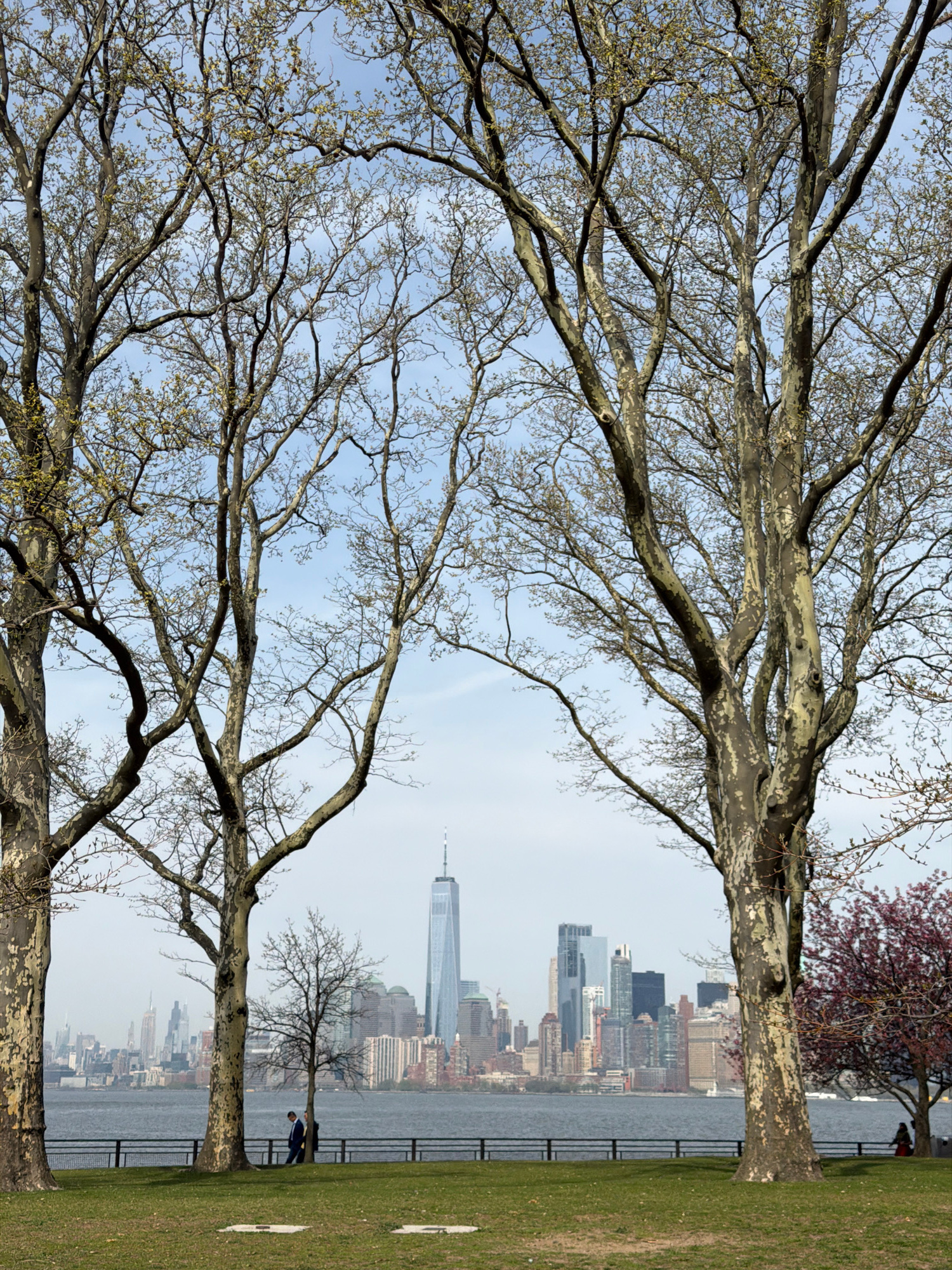 The image captures a panoramic view of a city skyline across a body of water, framed by large, bare-branched trees in the foreground. In the immediate foreground, several mature deciduous trees standβ¦read more