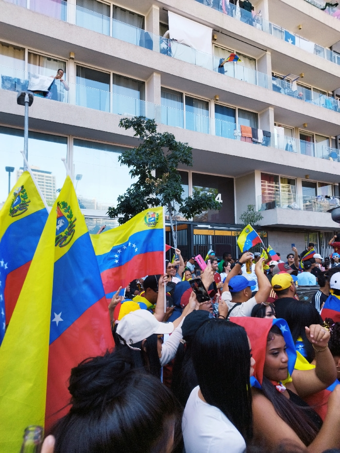 An urban street scene in Santiago, Chile, depicts a large gathering of people, most of whom are holding Venezuelan flags, positioned in front of a multi-story, modern apartment building. The building…read more