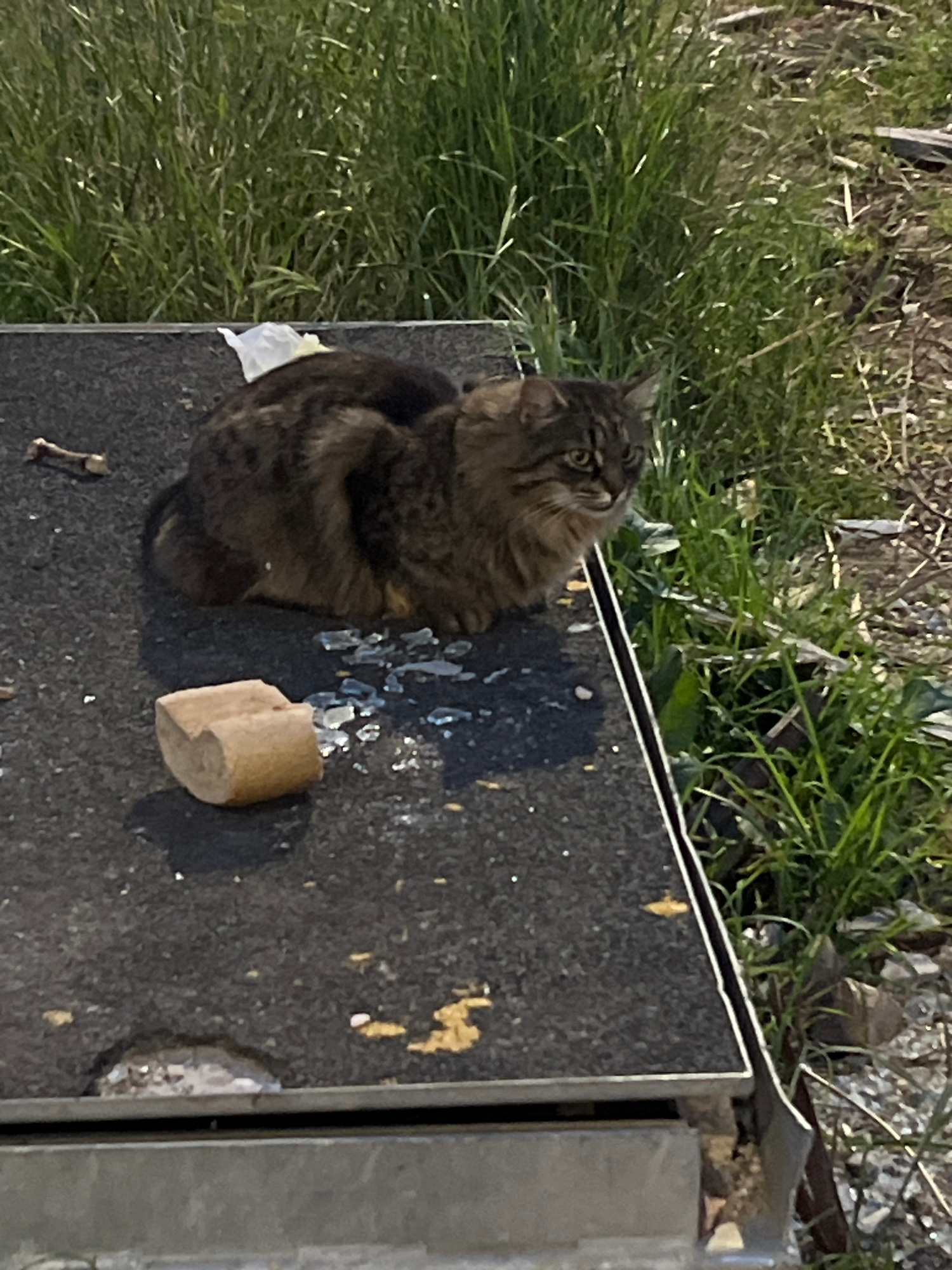 A long-haired tabby cat sits on a dark grey, possibly concrete or asphalt surface, with a piece of light brown wood or cardboard nearby. There are scattered white and translucent specks on the surface…read more