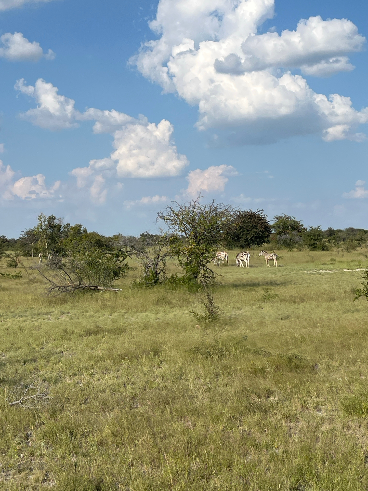The image shows a grassy field under a partly cloudy sky. Several zebras are standing in the field, near some trees. The location is likely near Gucta, Botswana.