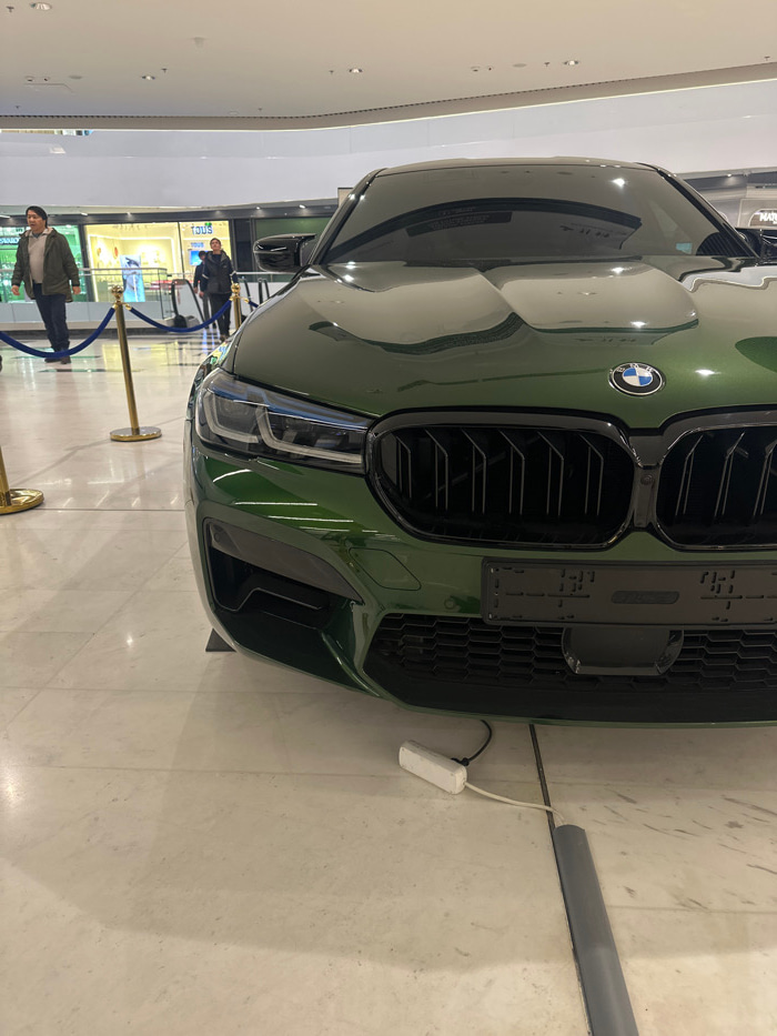 The image displays the front section of a dark green BMW sedan, positioned as a display vehicle inside a modern shopping mall. The car features a prominent black kidney grille, LED headlights, and a b…read more