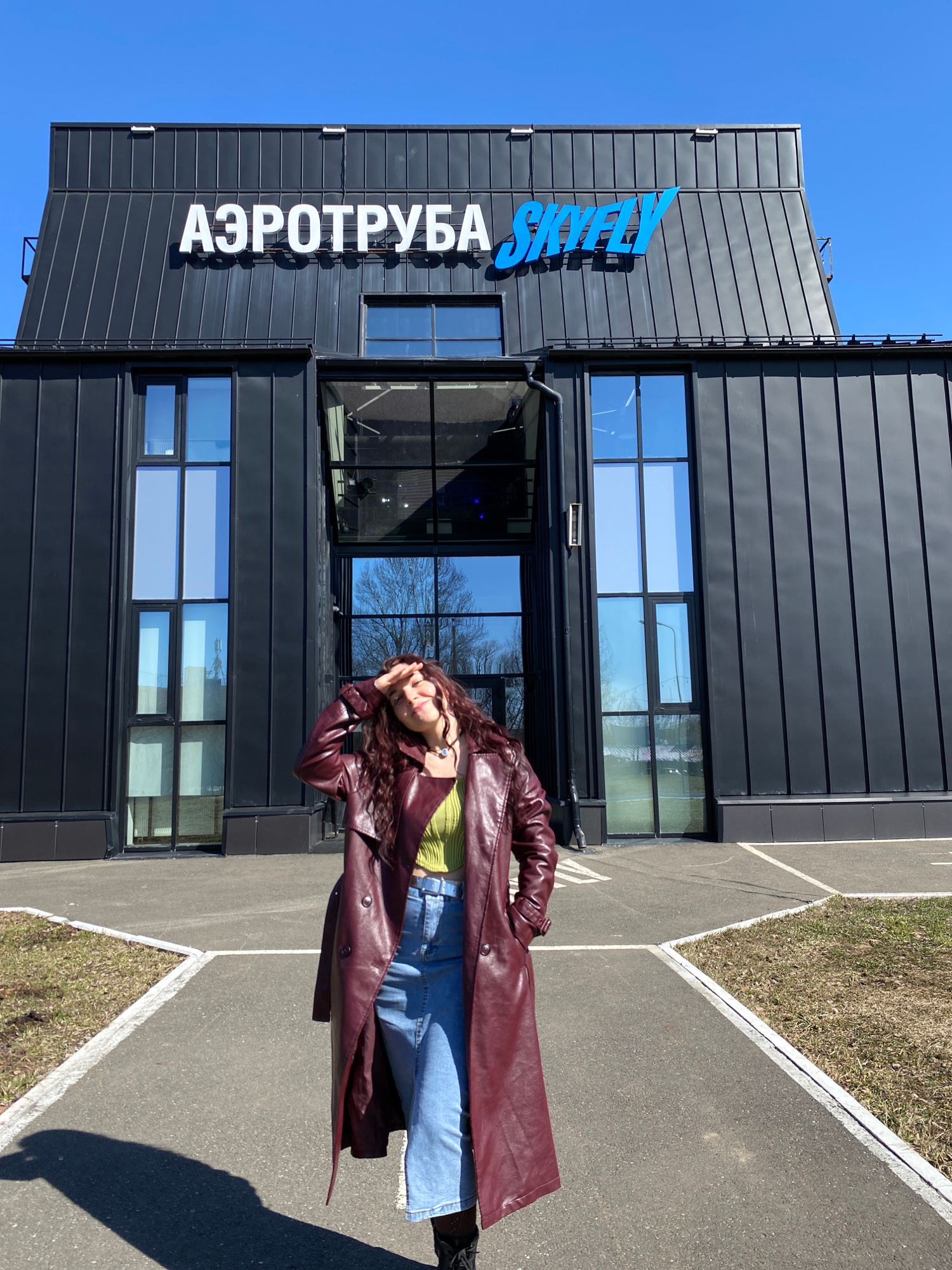 A full-body shot shows a woman in a burgundy leather trench coat, a light green shirt, and blue jeans, standing on a paved surface with grassy edges. She holds her hands up to her face. Behind her is…read more