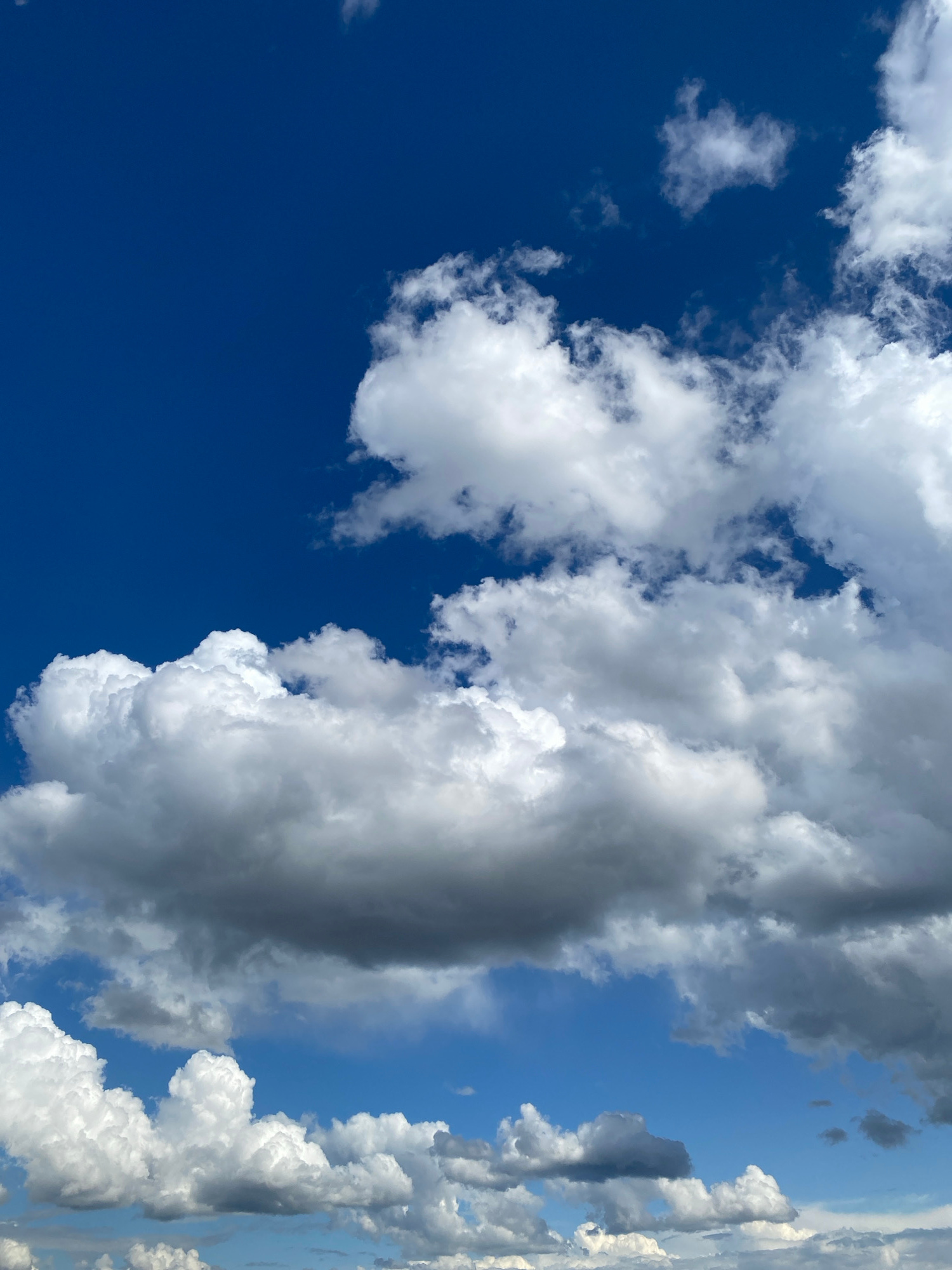 The image captures a daytime sky filled with clouds. The left side of the frame features a deep blue, cloudless sky. Moving towards the right, the sky is increasingly covered with puffy, white cumulon…read more