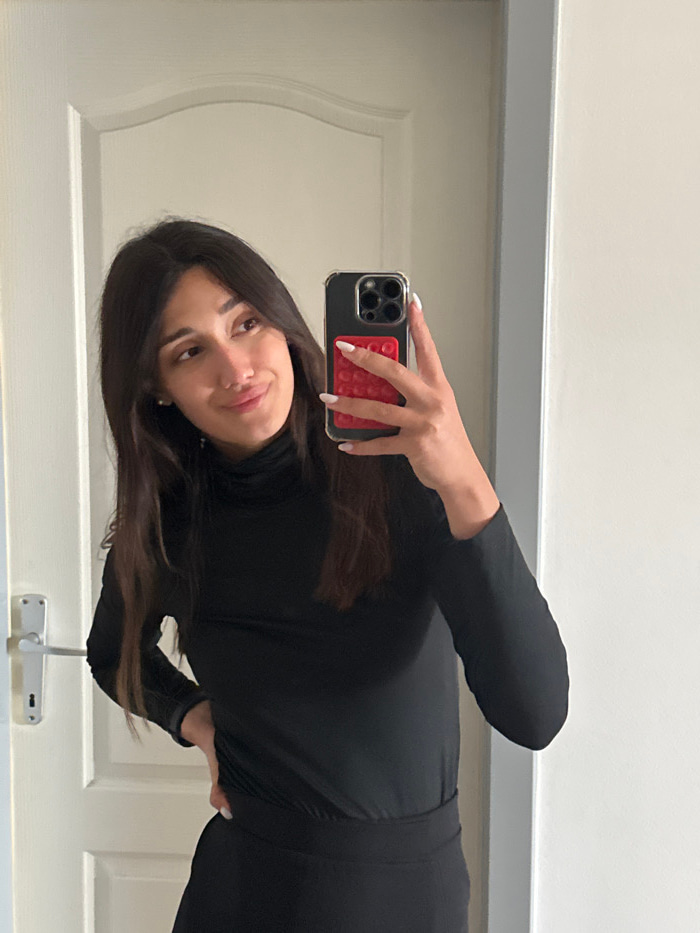 The image depicts a female individual, likely a young adult, taking a mirror selfie in an interior location within Kraljevo, Serbia. She has long, dark brown hair and is dressed in a black long-sleeve…read more