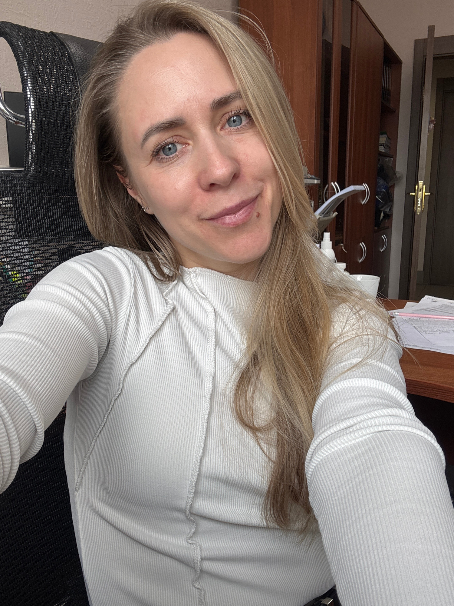 A blonde woman with blue eyes is in a chair in what appears to be an office. There is a wooden cabinet with drawers in the background. There is a computer monitor and paperwork on the desk. It is not…read more