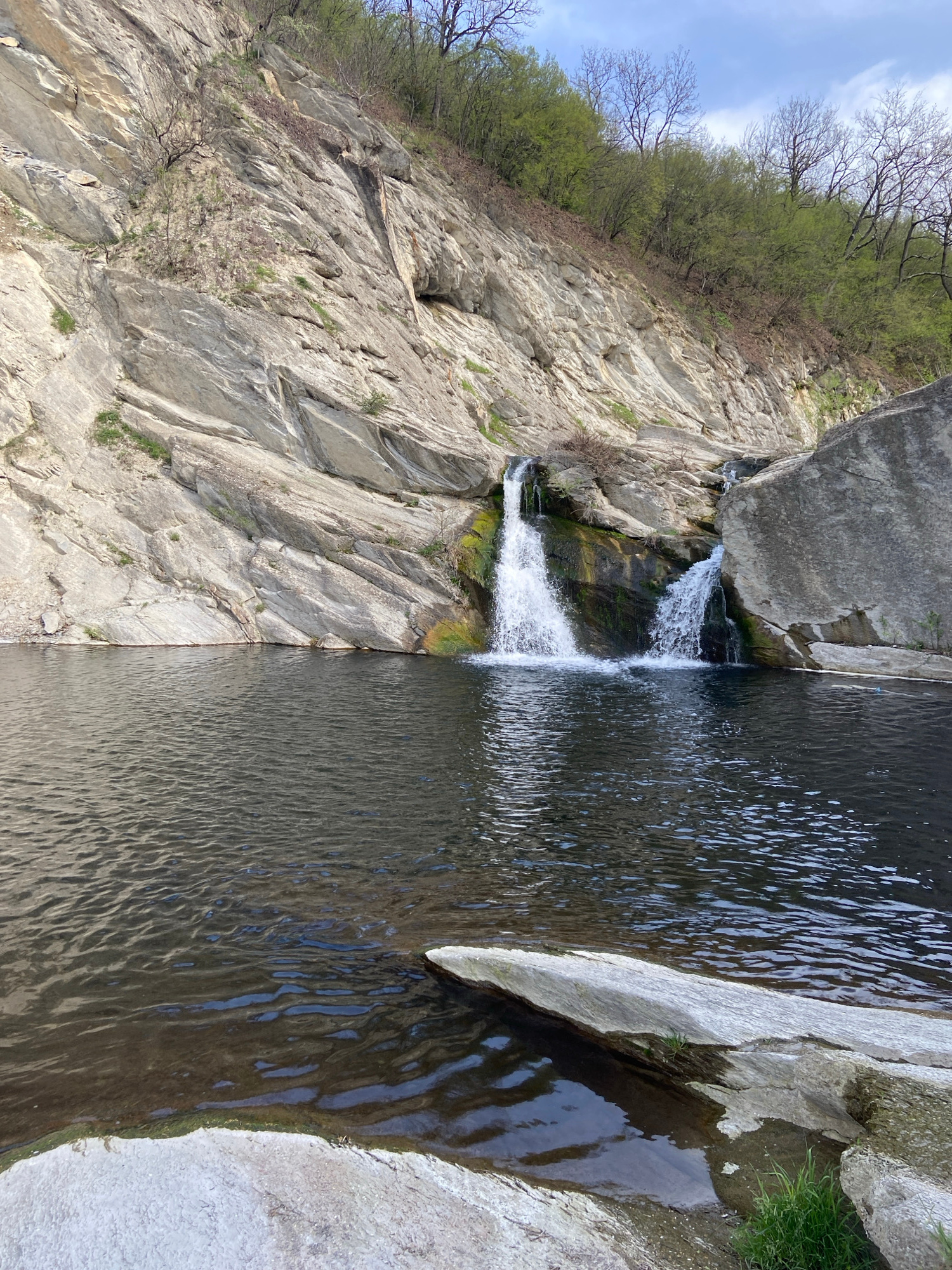 The image shows a waterfall in Kapinovo, Bulgaria. Water cascades down a rocky cliff face into a pool. The cliff is gray and rugged with sparse vegetation. Trees with budding green leaves line the top…read more