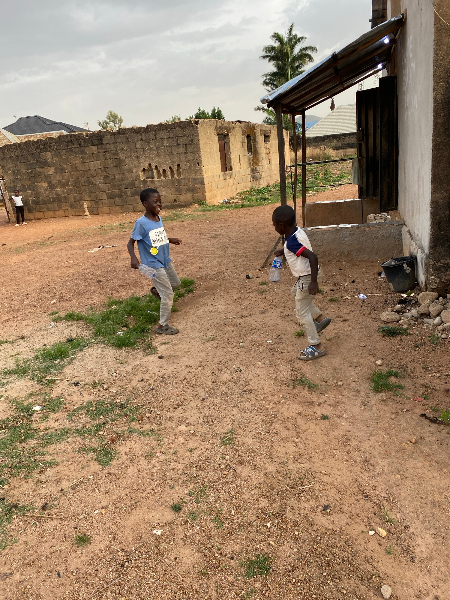 Two young Black boys are on a dirt lot in Bukuru, Nigeria. One boy wears a blue shirt with a yellow smiley face and lettering. The second boy wears a white shirt with colored stripes. A partially cons…read more