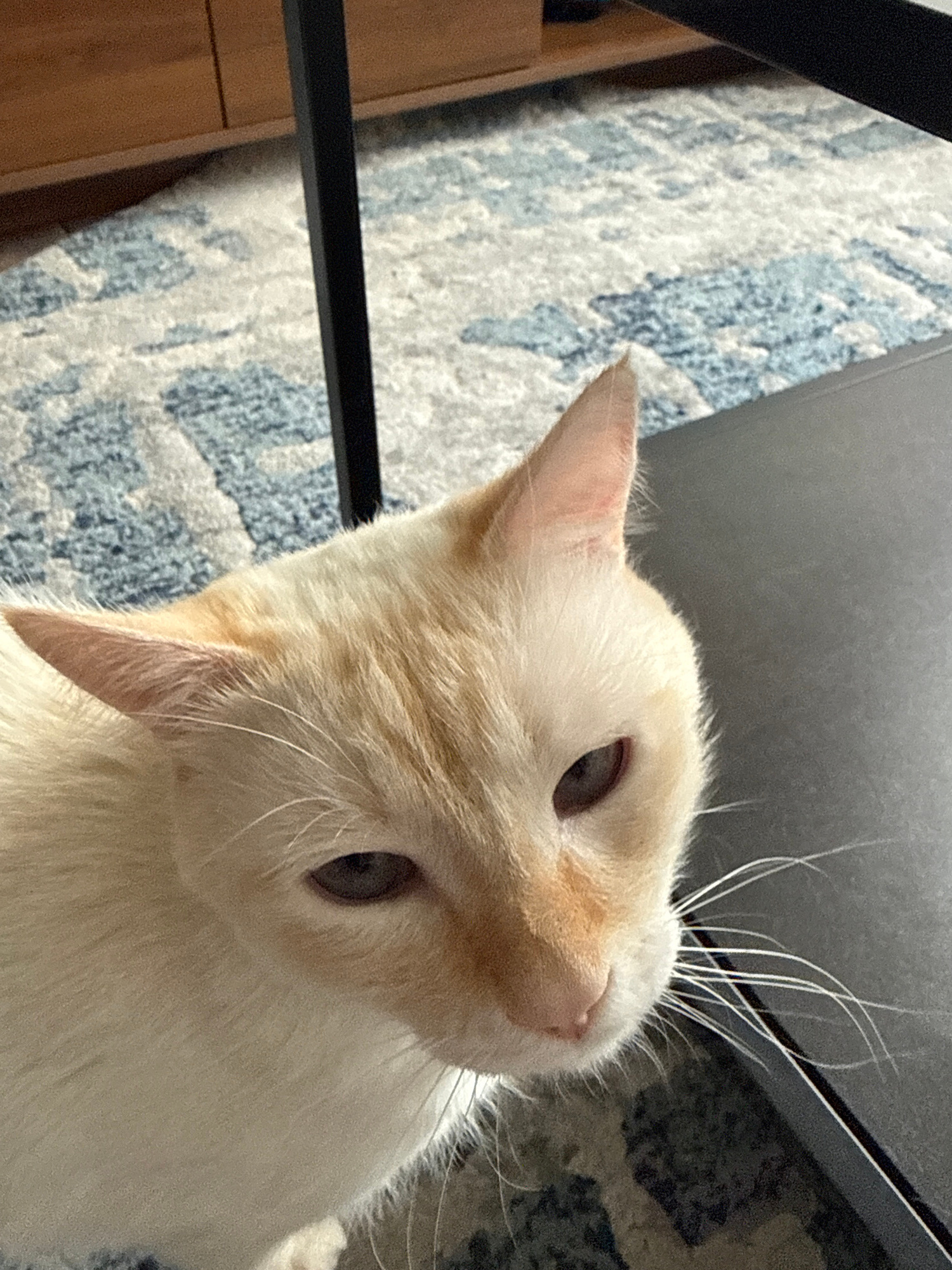 A close-up, high-angle shot shows a light-colored cat tilting its head, with its face angled upwards towards the camera. The cat's fur is primarily white with patches of orange on its head, nose, and…read more