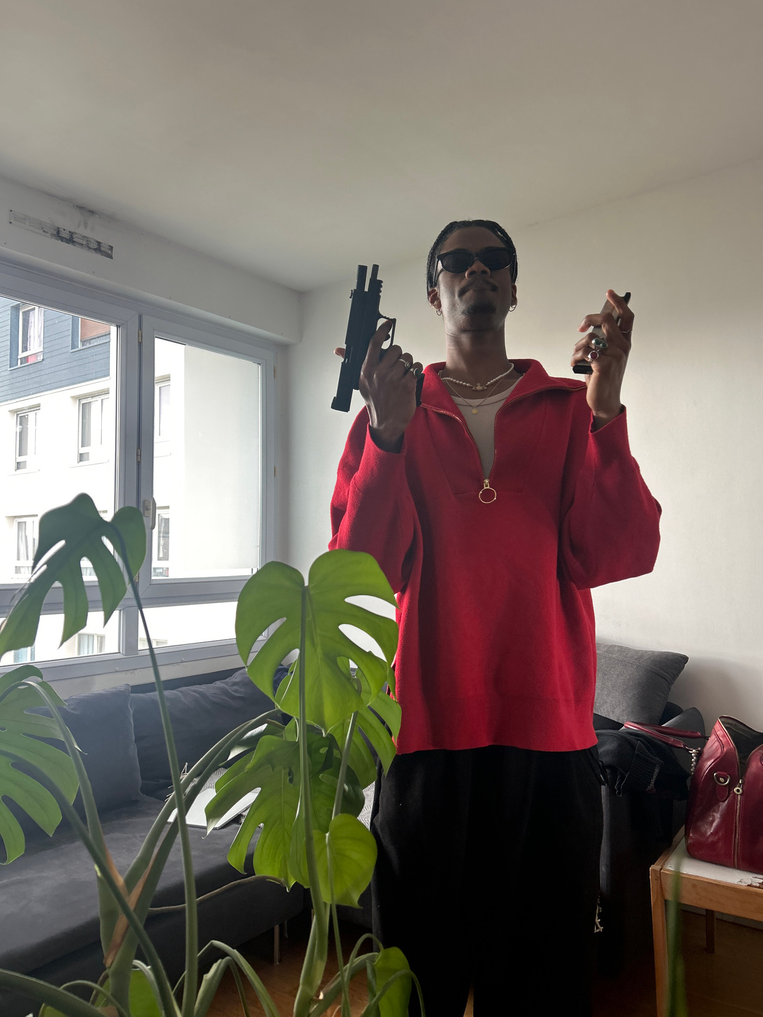 A person, presumably male, stands indoors, holding what appears to be a handgun in his right hand and a cellphone in his left. He is wearing sunglasses, a red zip-up sweater, black pants, and a chain…read more