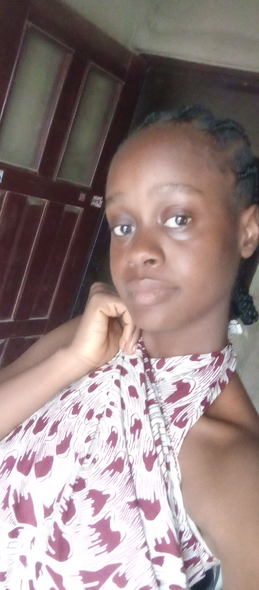A close-up portrait features a young woman indoors in Akwanga, Nigeria. She has dark skin, dark eyes, and her hair is styled in intricate dark braids. She looks directly at the camera with a neutral, calm expression. She is wearing a light-colored, sleeveless top that features a distinctive dark red or maroon patterned design, which appears to be abstract feathers or swirling motifs. Her right hand is gently positioned near her chin or jawline. The background consists of dark wooden paneling or a door with several lighter, rectangular insets, indicating a simple interior setting. The lighting is soft and even, suggesting indoor ambient light during daylight hours. There is no visible text in the image. | Open Wire