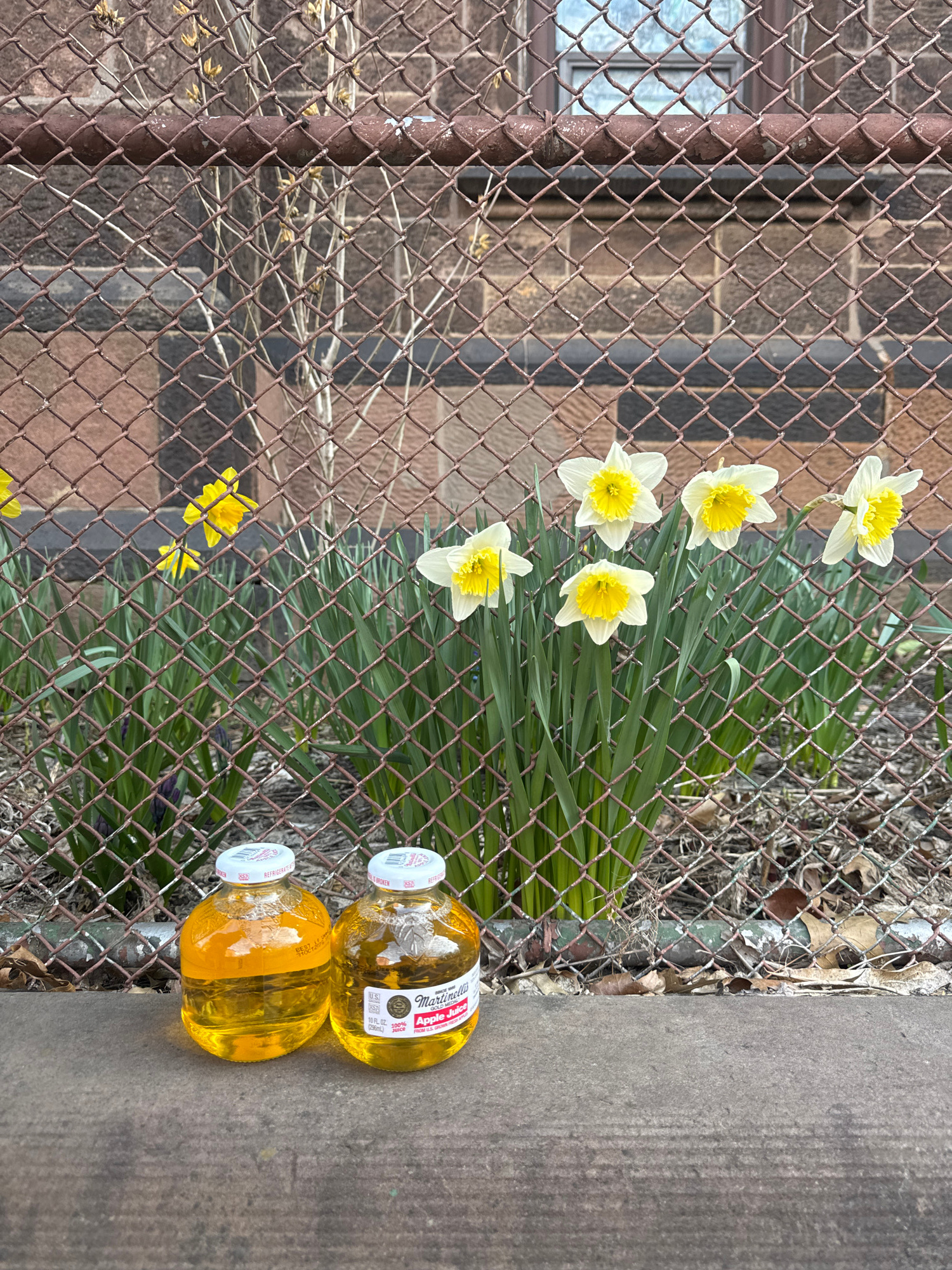The image captures a scene outdoors, adjacent to a weathered chain-link fence. On the left side of the frame, the fence reveals a building, possibly made of brown brick, with at least one window visib…read more