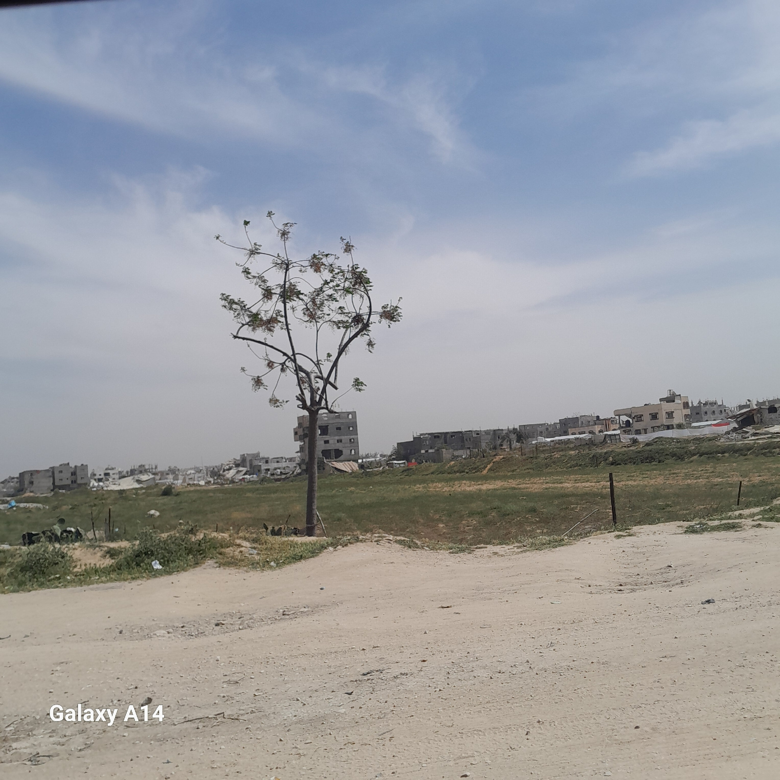 The image captures a landscape in al-Qarara, Palestinian Territory. A thin tree with sparse foliage stands in the foreground. Behind the tree is a dirt road or path alongside a grassy area. Beyond the…read more