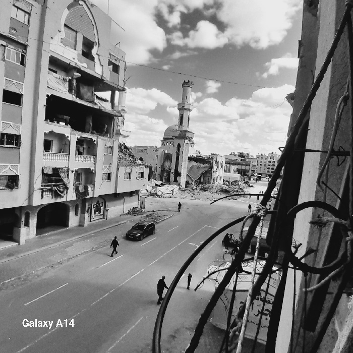 This black and white image, captured from an elevated position in the city of Khan Yunis, Palestinian Territory, depicts a street scene exhibiting widespread structural damage under a sky with scatter…read more