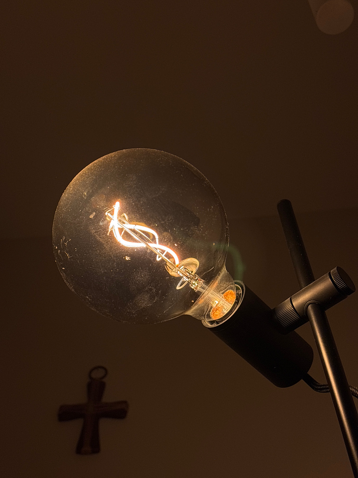 The image shows a lit lightbulb with a visible filament, attached to a black lamp fixture. The fixture has a circular joint and a thin, black arm extending horizontally. The background is dark brown. To the lower right of the lightbulb, a faint, out-of-focus crucifix hangs on the wall. There is no information that indicates that the image was taken in Santa Clara Ocoyucan, Mexico. Therefore, I cannot include the location in the description. | Open Wire