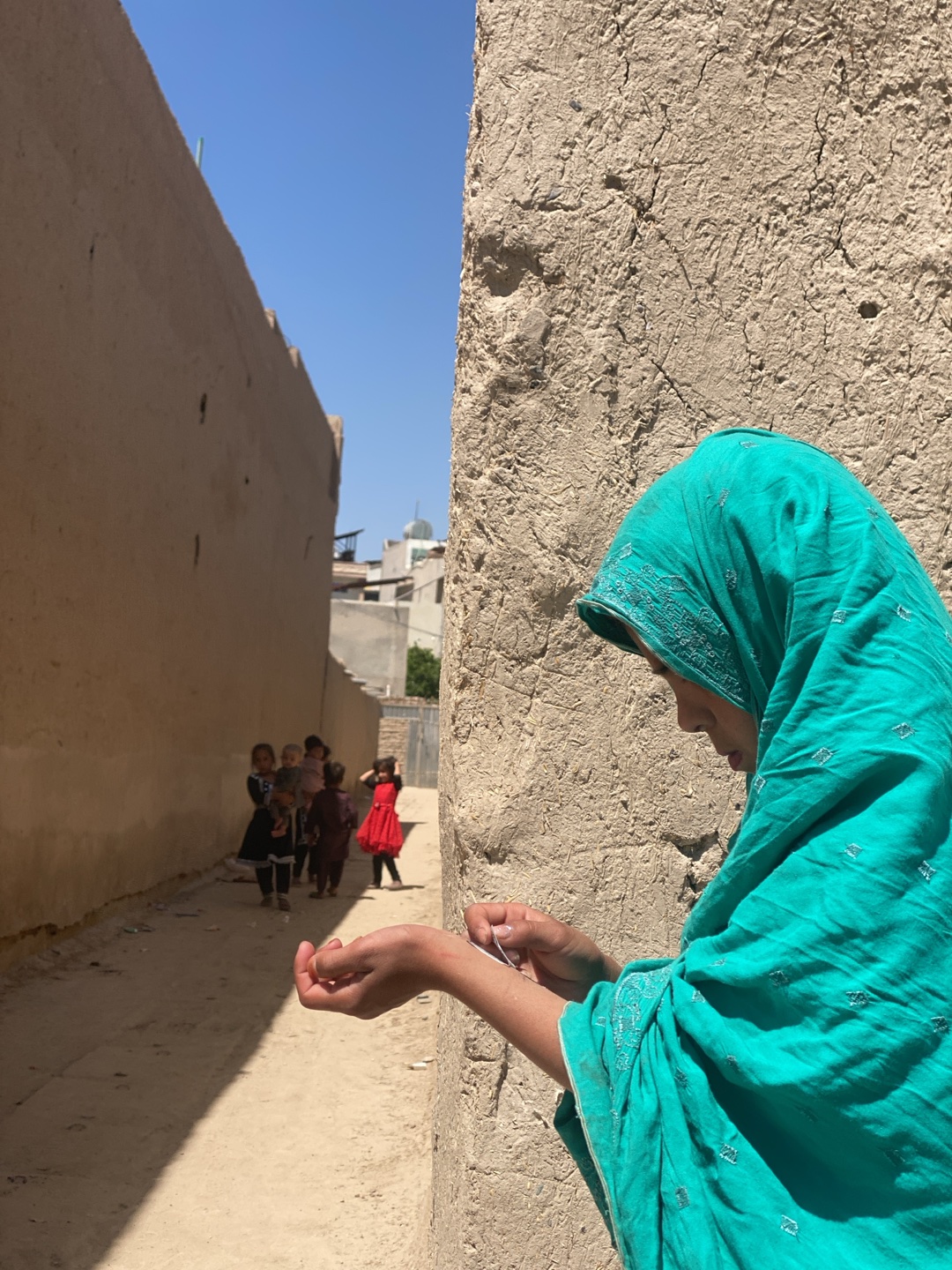 In a Kandahar, Afghanistan alleyway, a person wearing a turquoise headscarf and clothing stands near a textured wall. The person's hands are outstretched, and they appear to be examining something sma…read more