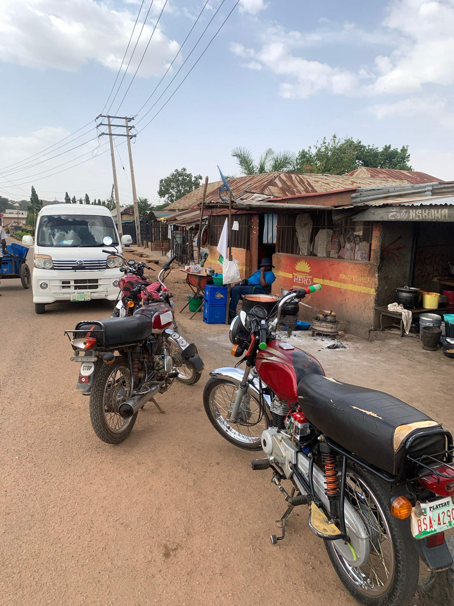 The image depicts a street scene in Jos, Nigeria, featuring several motorcycles parked near a roadside business. A white van is parked on the left side of the road. Utility poles and wires are visible…read more