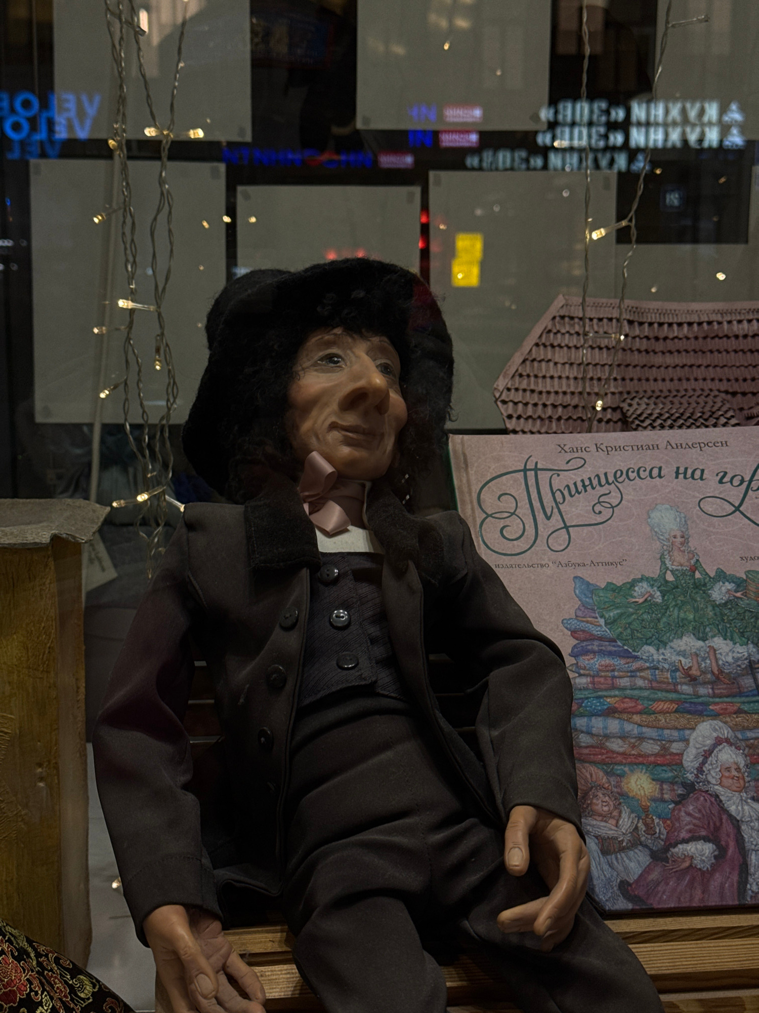 Here's a detailed description of the image: **Scene Overview:** The image shows a display, likely in a store window in Moscow, Russia. The display features a mannequin of an older man in historical c…read more