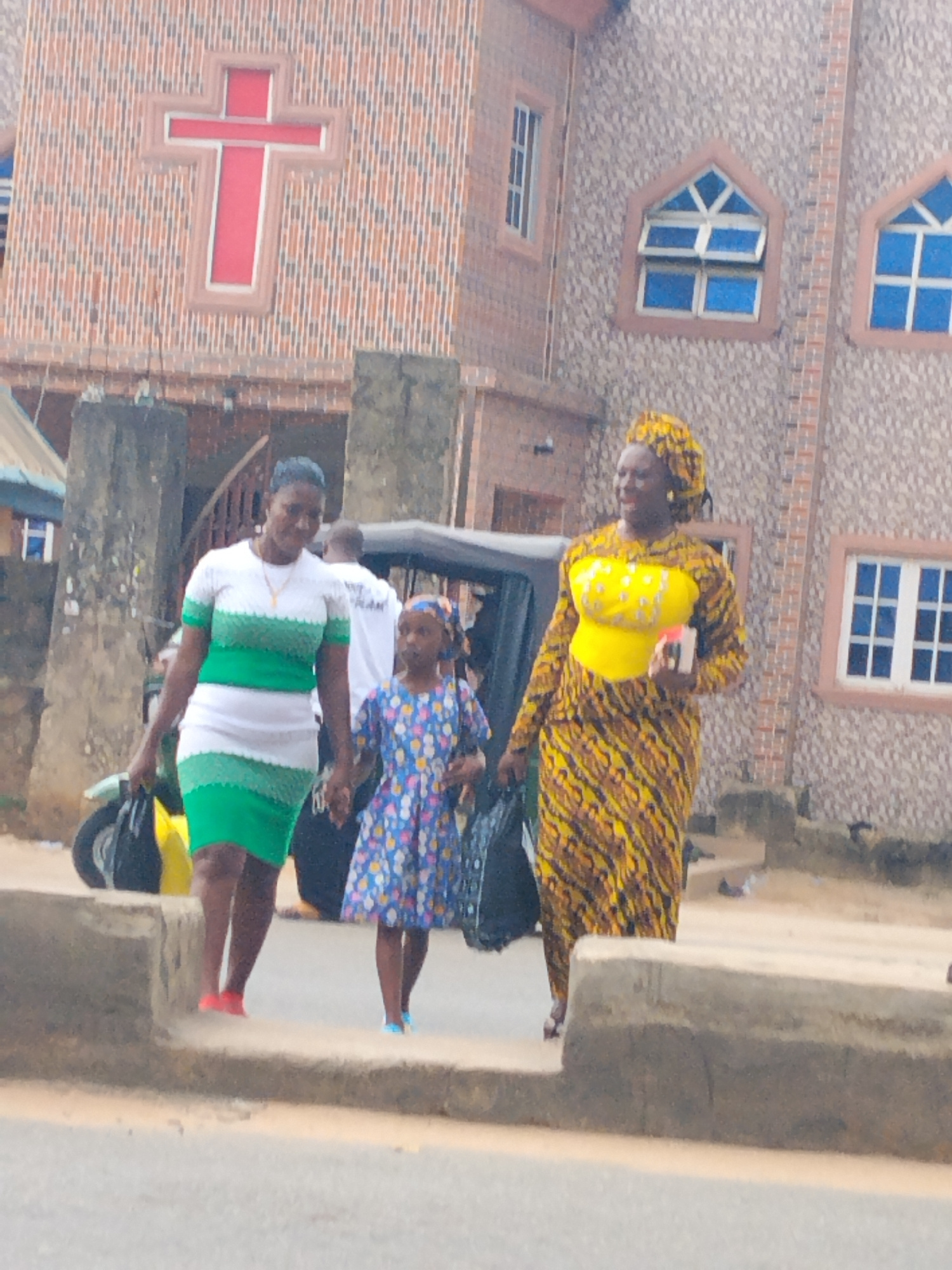 Three people walk on a sidewalk in front of a brick building. The building has a large red cross on its facade and several windows with blue panes. The person on the left is wearing a white and green…read more