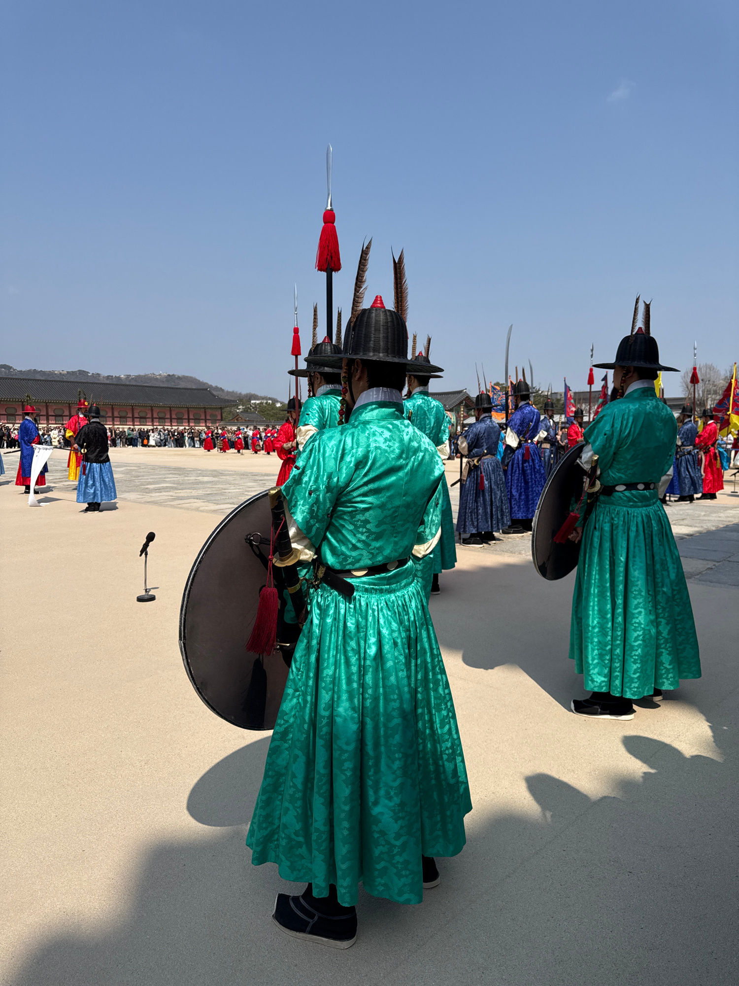The image captures an outdoor ceremonial event occurring in the courtyard of Gyeongbokgung Palace, Seoul, South Korea. The scene is illuminated by strong sunlight under a clear, light blue sky. In th…read more