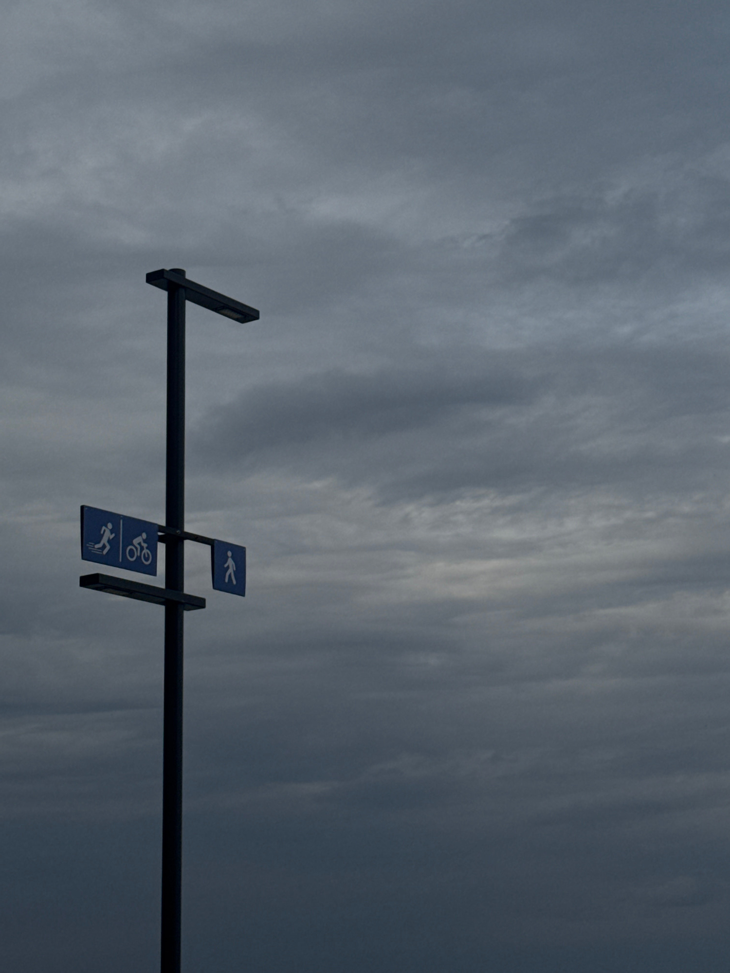 The image captures a minimalist scene of a dark, horizontal pole set against an overcast sky. Three blue rectangular signs with white pictograms are attached to the pole, indicating different types of…read more